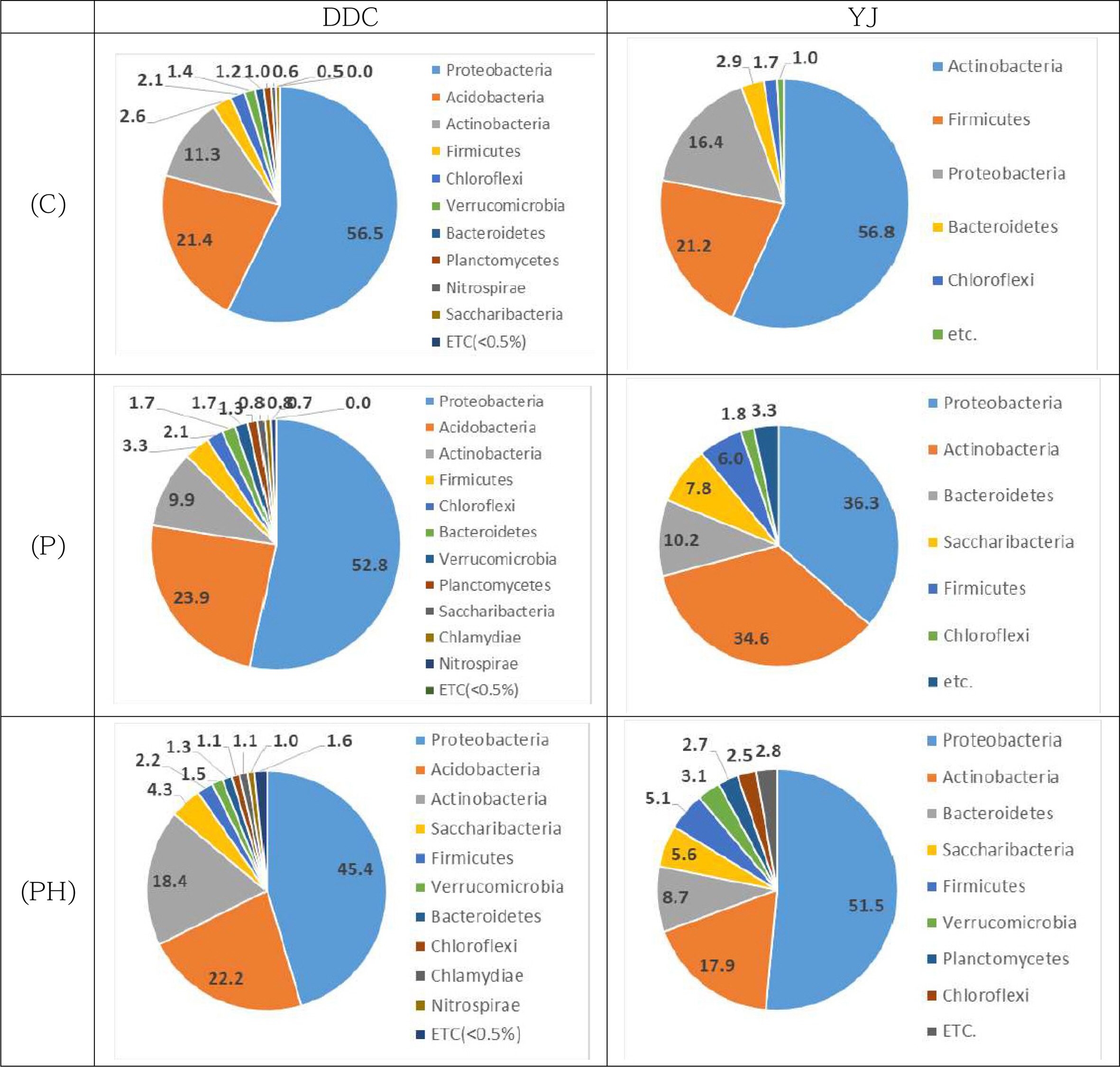 미생물군집 분석결과를 문(phylum) 수준에서 비교하면 Fig. 5와 같다. DDC토양 우점미생물은 모든 처리구에서 Proteobacteria > Acidobacteria > Actinobacteria 순이지만, P 및 PH처리구에서는 상대적 비율이 변화하였다. P 및 PH처리구에서 Proteobacteria가 감소하고, Acidobacteria이 23.9%로 증가하였고, PH처리구는 대조군 대비 Acido- bacteria는 0.8% 소폭 증가하고 Actinobacteria는 7.1% 증가하였다. YJ토양의 미생물군집은 변화폭이 컸는데, 대조구에서 Actinobacteria가 56.8%로 우점하였으나, P 및 PH처리구에서 Proteobacteria가 우점종이 되었고, Firmi- cutes가 5% 내외로 감소하였다. DDC토양과 YJ토양에서 미생물군집의 가장 큰 차이는 Acidobaceria의 우점여부이다. DDC토양에서 최소 21.4%이었으나, YJ토양에서는 처리구에 관계없이 전무하였다. Acidobacteria는 토양미생물 과반이상을 차지하며 가장 광범위하게 분포하는 미생물로 C, N 순환의 keystone 미생물이며, siderophore 생산으로 식물-근권미생물 관계에서 매우 중요한 미생물이다(Kalam et al., 2020). 그러나 이름에서도 알 수 있듯 산성조건을 선호하는 미생물이기에(Kuske et al., 1997), YJ토양의 높은 pH 조건에서는 우점하지 못한 것으로 판단된다. 이외에도 YJ토양 PH처리구에서 특이하게 Planctomycetes가 2.7%로 새롭게 증가하였는데, 이 미생물은 혐기성 암모니아 산화인 anammox 반응으로 탄소 및 질소 순환에 관여한다. 콩과식물 뿌리의 질소고정미생물이 질소를 공급하고, 통기성이 좋지 않은 YJ토양 특성으로 인해 국부적으로 혐기성 상태가 형성되었기에 생장이 가능했던 것이라 사료된다.