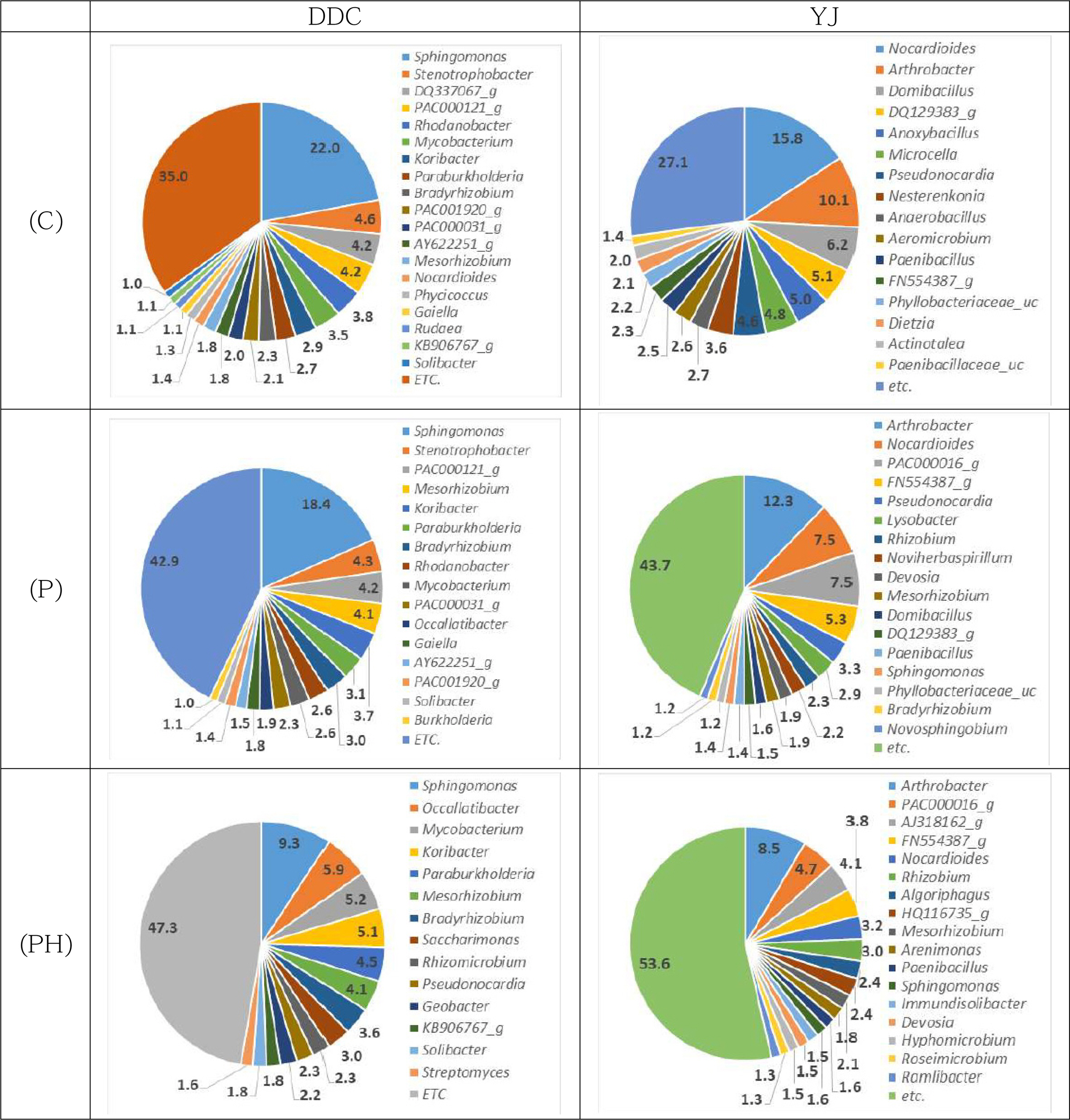 YJ토양에서는 처리군에 따라 미생물군집의 급격한 변화가 관찰되었다. YJ대조군에서는 Nocardioides와 Arthro- bacter가 우세하였으나, YJ_P 및 PH처리구에서는 Arthro- bacter가 우점도가 감소하고 다양성이 확대되었다. 콩과식물 식재의 영향으로 질소고정미생물인 Rhizobium 및 Mesorhizobium 우점도가 상승하였는데, YJ_P 및 PH 처리구에서 질소고정미생물 우점도는 각각 4.2 및 5.1%이었다.