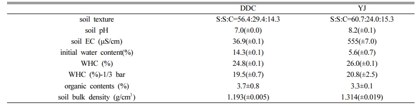 두 종의 토양에 대하여 측정한 물리화학적 특성 및 토양효소활성은 Table 1과 같다. 실험에 사용한 DDC토양 토성은 양토(loam)이었고, YJ토양은 식양토(clay loam)이었다. 토양 pH와 EC는 DDC 토양이 각각 7.0 및 36.9 μS/cm이었으며, YJ토양은 각각 8.2 및 555 μS/cm로 열처리 토양 특성인 pH 및 전기전도도 증가가 관측되었다(Pape et al., 2015; Vidonish et al., 2016). 두 종의 토양은 WHC(water holding capacity, 1/3 bar)가 24.8 및 26.0%로 큰 차이를 보이지 않았으나, YJ토양은 뭉치지 못해 입단성이 떨어졌고, 수분이 많으면 졸(sol) 상태가 되어 흐르고 건조해지면 딱딱하게 굳었다. 토양의 용적밀도는 DDC토양이 1.193±0.005 g/cm3이며, YJ토양이 1.314± 0.019 g/cm3으로, YJ토양이 약 10% 더 높았다(Table 1).