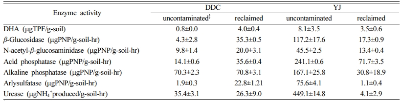 동일 지역에서 채취한 비오염토양과 처리토의 토양효소활성은 Tabel 2와 같다. DDC토양은 처리 후 urease를 제외한 나머지 항목에서 토양효소활성이 증가하였다. 토양경작에 의한 생물활성증가가 원인으로 판단되며, urease 감소는 토양경작 과정에서 발생하는 N 부족현상에 기인한 것으로 판단된다. 반면, YJ토양에서는 열처리 과정에서 미생물이 사멸하여 모든 항목에서 효소활성이 크게 감소하였다. DDC토양과 YJ토양을 비교하면, 토양효소활성은 Pase_a만 제외하고, DDC토양에서 YJ토양에 비해 훨씬 높은 효소활성을 보였다.