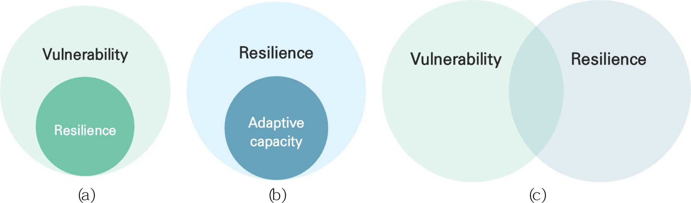 재난 연구자들 사이에서 리질리언스는 Fig. 1과 같이 사용되는데, 리질리언스를 결과적 현상에서 해석하는 관점(Fig. 1a)과 의사 결정 과정(Fig. 1b)으로 해석하는 관점에 따라 달리 정의할 수 있다. Fig. 1a에서 리질리언스는 재난에 대응하고 재난으로부터 회복될 수 있는 능력으로, 리질리언스는 취약성의 한 요소로 간주된다(Manyena,, 2006). 반면, Fig. 1b는 리질리언스를 재난 관리 능력을 강화하려는 전반적인 과정으로 보고 적응력을 리질리언스의 한 요인으로 규정하는데, 대부분의 재난 연구자들은 이와 같은 시각으로 리질리언스를 연구하고 있다(Paton and Johnston, 2001; Paton and Johnston, 2006; Bruneau et al., 2003; Tierney and Bruneau, 2007). Fig. 1c는 취약성과 리질리언스를 분리하지만 필요에 따라 연결시키는 경우로서 Cutter et al.(2008)이 이와 같은 관점을 채택하였다.