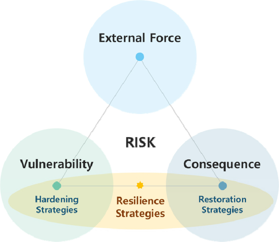 Fig. 2 Relationship between risk, vulnerability, and resilience (after Aamir, 2011). The risk is assessed using the probability and magnitude of external forces and consequences, while the consequences depend on the vulnerability of inventory to external forces. The resilience strategies include restoration strategies to reduce consequences as well as hardening strategies to reduce vulnerabilities. |