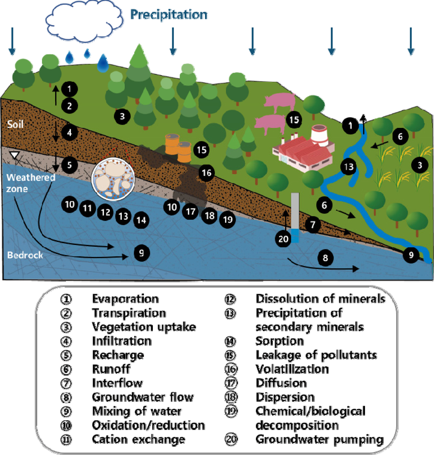 Fig. 3 Complex groundwater system due to the interaction among physical, chemical, and biological components in heterogeneous geologic media (modified after Appelo and Postma, 2005). Recently, anthropogenic activities (e.g., groundwater pumping and contaminant loading) make it more complicated. |
