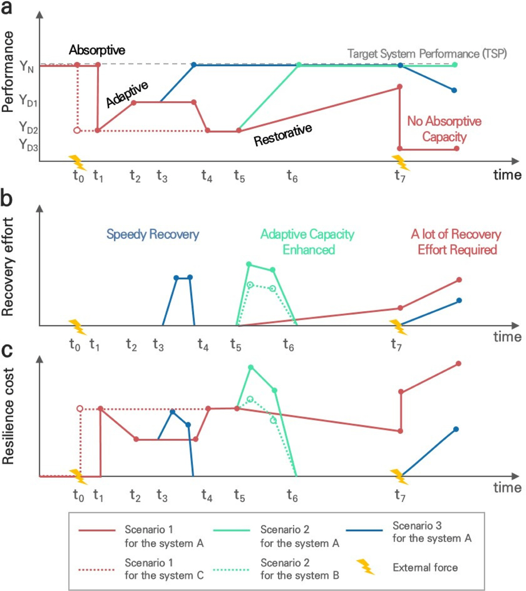 Fig. 4는 복구 전략이 시스템의 성능(SP)에 미치는 영향도 보여준다. 시스템 A에 대하여 시나리오 1은 t5에서 복구자원을 서서히 투입한 경우로(빨간색 실선), 복구가 완료되기 이전 두 번째 재난이 닥칠 수 있고 두 번째 재난으로 인해 SP가 급감하는 경우를 보여준다. 반면, 시나리오 3은 조기(t3)에 복구자원을 투입하는 경우로(파란색 실선), 적은 복구 노력(RE)으로 SP를 원래 상태로 회복시키는 경우이다. 그러나 두 번째 재난에 쉽게 영향을 받는다(Fig. 4a). 한편, 시나리오 2는 t5에서 복구자원이 대량 투입되어(초록색 실선) 시스템의 흡수력까지 강화시킨 경우로(예: 지진의 경우 내진보강), 두 번째 재난에 노출되어도 피해를 입지 않는 시스템을 만들 수 있음을 보여준다. 궁극적으로 시나리오 2와 같이 어떤 재난이 닥쳐도 목표 성능(targeted system performance; TSP)을 유지하는 시스템을 갖추는 것이 리질리언스를 확보한다는 의미가 된다.