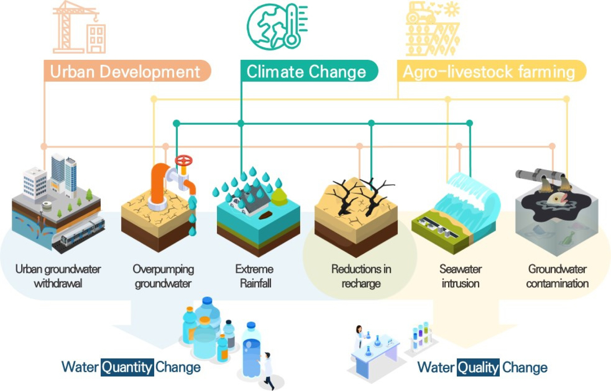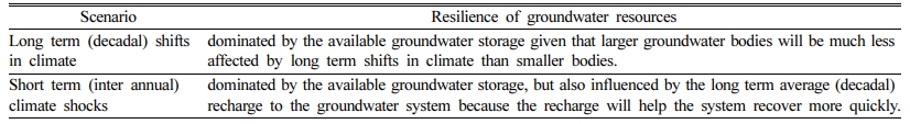 현재까지 대부분의 지하수 리질리언스 연구는 물부족 국가를 대상으로 기후변화에 따른 수자원 리질리언스 확보 관점에서 연구되고 있다(MacDonald et al., 2011; Gronwall, J., Oduro-Kwarteng, S., 2017; Cuthbert et al., 2019; World bank, 2020). 이때, 외부력은 기후변화가 되고(Fig. 5), 리질리언스가 평가되는 시스템은 수자원을 공급받는 지역사회 또는 기후변화에 영향을 받는 지하수(수자원) 환경이 된다. 한편, 지하수 환경은 도시화에 의해서도 변화 압력을 받고 있는데(Lee and Koo, 2007; Chung et al., 2012; Foster, 2020; Foster et al., 2020), 도시화로 인한 외부력과 그에 대한 지하수 리질리언스 연구 사례는 기후변화에 비하면 드문 편이다. Shamsudduha (2013)는 남아시아에서 도시개발 및 기후변화에 대한 지하수 리질리언스를 논의하였다. APN E-Lib(2020)은 기후변화 및 도시의 성장과 개발에 대한 지하수 리질리언스를 평가하기 위한 프로젝트로서, 지하수가 중요한 수자원인 아시아의 주요 도시에서 지속가능한 수자원 관리를 위해 시작되었다.