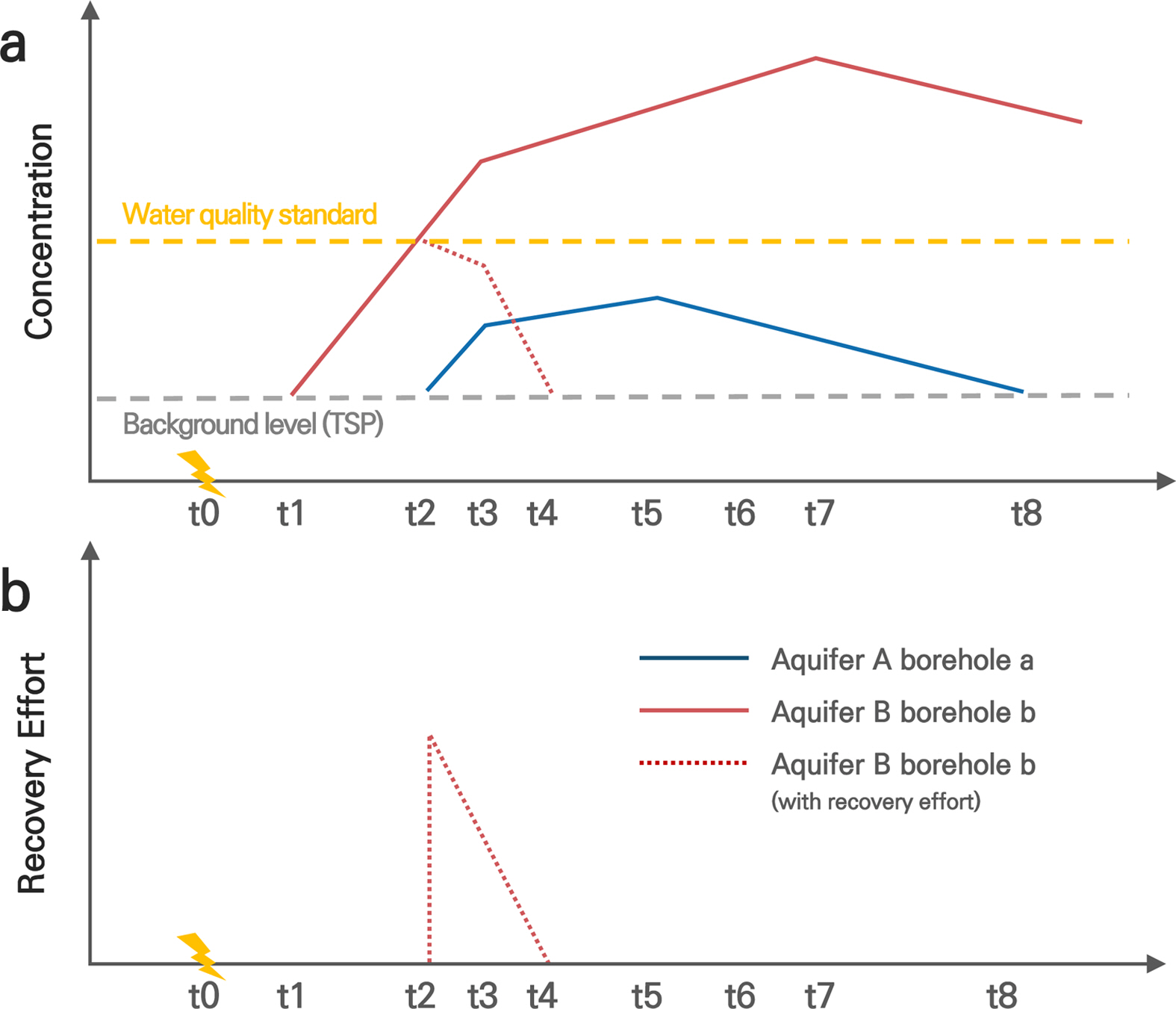 Fig. 7 Changes in concentration (system Impact; SI) and recovery effort (RE) in each aquifer due to groundwater contamination. The boreholes ‘a’ and ‘b’ are assumed to be located at the same distance from the leakage point and show the similar concentration level before contamination. The points indicate the measurement times, and the changes between measurements are assumed to be linear. |