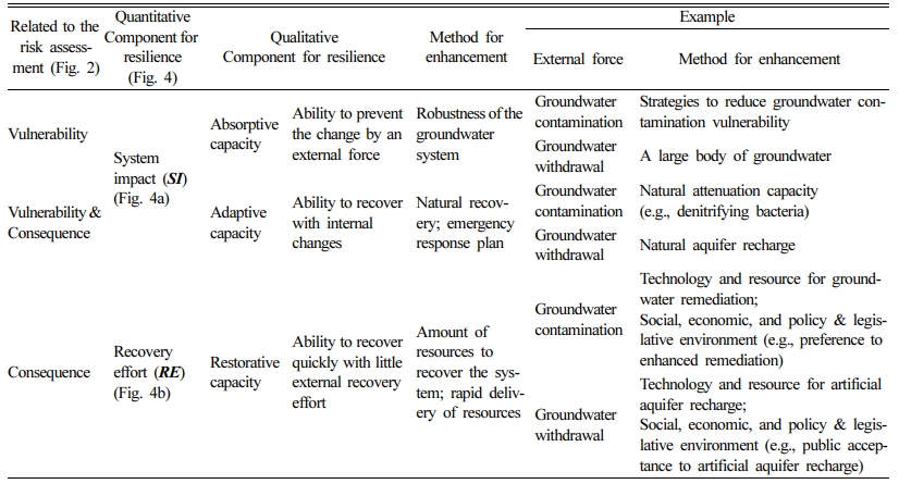 동일한 오염원에 노출되어도 지하수 오염도가 기준치를 넘지 않는 지하수 환경(또는 관정)의 경우(Fig. 7에서 대수층 A의 관정 a), 오염원으로 인한 영향(SI)이 적으며, 이것은 곧 흡수력 또는 적응력이 크다고 할 수 있다(Table 1; Fig. 4a). 이는 기존의 지하수 오염 취약성 평가에서 취약성이 낮은 경우를 의미한다. 리질리언스 연구는 취약성 평가 요소 이외에도 빠르게 회복할 수 있는(쉽게 정화될 수 있는) 특성(복구력)을 포함하는 것으로(Fig. 2), 복구력을 갖춘 환경에서는 대수층 B의 관정 b가 수질 기준을 초과하지 않고 빠르게 배경수질로 회복될 수 있다는 것까지 평가한다(Fig. 7의 빨간색 점선). 여기서 외부자원 없이 이루어지는 자연저감능력의 경우는 적응력으로 평가할 수 있으며, 반면 외부자원을 활용하는 인위적 저감활동의 경우는 복구력으로 평가한다(Table 1).