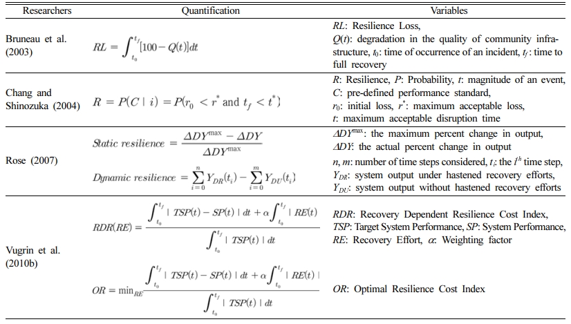 리질리언스를 정량적으로 평가하기 위해서는 시스템의 성능(SP; Fig. 4a의 Y에 해당)을 측정할 수 있어야 한다. 시스템(예: 지하수 또는 토양)마다 측정 가능한 Y가 다를 수 있고, 동일한 시스템에 대해서도 외부력(예: 지하수 오염 또는 유출 지하수)에 따라 측정해야 할 Y가 달라질 수 있다. Y가 결정되면 리질리언스를 측정할 수 있는데, 자주 사용되는 방법이 Table 3과 같다. Bruneau et al. (2003)은 기반시설의 상태 악화(Q(t))를 예측한 후 리질리언스 손실(Resilience Loss, RL)로 지진에 대한 지역사회의 리질리언스를 측정하였는데, 최근에는 Im et al.(2020)이 Bisphenol A가 대수층의 리질리언스에 미치는 영향을 측정하기 위해 대수층의 RL을 평가하였다. Chang과 Shinozuka (2004)은 미리 설정한 기준치(C)를 만족시킬 확률(Pro- bability, P)로 리질리언스(Resilience, R)를 측정하였으며, 이와 유사하게 Lee et al.(2013)이 수자원 시스템의 회복도(resilience)를 용수부족이 발생한 이후 얼마나 빨리 정상상태로 복귀하는지의 확률로 평가하였다. Rose(2007)는 생산량의 변화율로 경제 리질리언스(Static resilience)를 측정하였는데, 이와 유사한 방법으로 최근 Shrestha et al.(2020)은 네팔 카트만두 계곡에서 3가지 지하수 양수 시나리오(S1, S2, S3) 및 2가지 기후변화 시나리오(RCP 4.5, RCP 8.5)에 대한 지하수 리질리언스(GwRe)를 3개의 시간대(2031, 2061, 2091)에서 평가하였다. GwRe는 식(1)과 같이 지하수 함양량(GwR)과 지하수위(GwL) 변화량의 비율로 평가되었다.