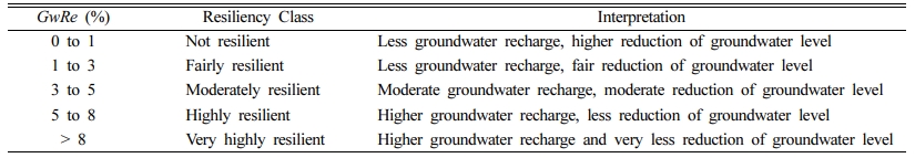 여기서 n은 평가연도이다. GwRe의 경우, 값이 클수록 더 리질리언스가 확보된 경우를 나타낸다. Shrestha et al. (2020)은 GwRe값을 이용하여 지하수 리질리언스를 5개의 등급으로 나눈 뒤(Table 4), 이를 지도에 도식화하여 리질리언스의 지역 편차를 확인하였다.