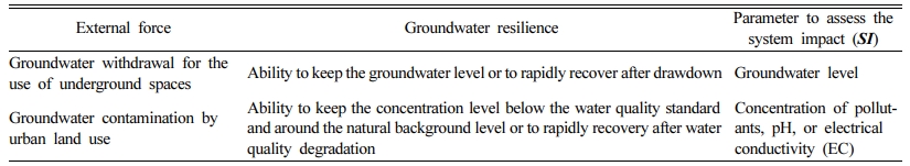 본 연구에서는 도시화로 인해 지하수에 발생하는 외부력 중 ‘토지이용 변화에 따른 지하수 오염’과 ‘지하공간 개발에 따른 지하수 유출’을 외부력으로 보고, 지하수 리질리언스를 구체적으로 정의한 후 SI과 RE를 측정할 수 있는 인자를 검토해 보았다. 외부력이 정해지면 외부력으로 인한 지하수 시스템의 변화량을 측정할 수 있는 변수를 선택할 수 있는데(Figs. 6a and 7a), 이는 Fig. 4a의 Y에 해당한다(Table 5). 반면 복구자원은 다양할 수 있다(Figs. 6b and 7b). 또한, 지하수 리질리언스를 확보하기 위해서는 오염원인별로(예: 유기용제, 축산폐수) 또는 지하수 유출 행위별로(예: 지하철 및 건축물 유출 지하수 발생) 외부력을 더 세분화하여 리질리언스를 정의할 필요가 있으며, 측정 인자도 국내에 가용한 자료를 검토한 후 결정되어야 한다. 그러나 본 연구에서는 도시 지역에서의 지하수 리질리언스 개념 정립 및 정량적 평가 가능성만 살펴보기로 한다.
