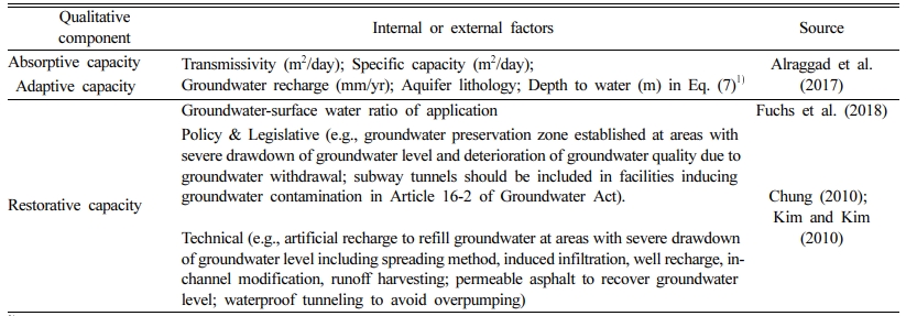 반면, 우리나라에서 최근 MOIS(2017)은 지역안전도 산출방식을 활용하여 2가지의 재해복원력(resilience) 지수를 제안하였는데, 지수1은 기존의 지역안전도에 미래 기후변화 시나리오를 바탕으로 변화할 위험환경을 반영하는 방법이고, 지수2는 취약성 지수, 물리적 역량, 제도적 역량을 각 축으로 하는 3D 공간에서 이상적인 안전지역과의 거리로 복원력을 평가하는 방식이다. 또한, Kim et al. (2018)은 Razafindrabe et al.(2009)의 CDRI(climate disaster resilience index)와 빅데이터 분석 기법을 이용하여 풍수해에 대한 복원탄력성(resilience) 지표를 개발하였고, 개발된 지표는 Choi et al.(2018)에 의해 안양천 유역의 시군구별 풍수해 복원탄력성을 평가하는데 활용되었다. 위 접근법들은 앞으로 국내에서 지하수 리질리언스를 평가하는데 참고할 만하다.