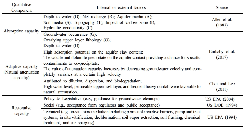 지하수 오염(외부력)에 대한 지하수 환경의 흡수력, 적응력, 복구력은 다양한 내·외부적 요소에 의해 결정되며, 이들이 곧 오염원에 대한 지하수 리질리언스를 결정한다. 따라서 지하수 오염에 의한 지하수 시스템의 변화량(SI) 및 회복속도에 영향을 미치는 요소를 확인할 필요가 있다. 예를 들면, 동일한 양의 질소오염원이 유입(외부력 발생)되었다 하더라도 지하수체별로 질산염의 농도 변화는 다를 수 있는데, SI와 RE에 영향을 미칠 수 있는 인자들을 정리하면 Table 7와 같다. 탈질미생물이 많은 지하수 환경의 경우, 자연저감능력(Choi and Lee, 2011; Embaby et al., 2017), 즉 적응력이 큰 환경이고, 지하수 정화 시스템이 잘 갖추어지고 정화기술에 대한 대중 수용성이 큰 경우는 복구력이 큰 환경으로 평가된다. 또한, 오염물질이 유출되는 상황을 방치하면 오염물질은 지하수 유동장을 따라 이류되고 확산할 수 있는데, 따라서 Fig. 4의 시나리오 3과 같이 신속한 대응이 시스템을 회복하기 위해 필요한 RE를 줄이고, 궁극적으로 지하수 리질리언스를 높이는 역할을 할 수 있다. 여기서 자연저감능력은 대수층의 오염물질 저감능으로서 지하수 대수층의 적응력을 높이는 요소인 반면, DRASTIC에서 토양이 가진 자연저감능(S)은 대수층의 오염을 차단하는(즉, 흡수력을 증가시키는) 능력으로(Aller et al., 1987) 달리 분류될 수 있다. 한편, DRASTIC의 대수층 매질 특성(A)와 수리전도도(C)는 지하수 유동 속도에 영향을 미치고, 이는 궁극적으로는 지하수의 자연저감능력에도 영향을 미치는 요소이며(Embaby et al., 2017), 따라서 리질리언스의 정량적 평가 과정에서 이들 요소의 상호작용도 고려할 필요가 있다.