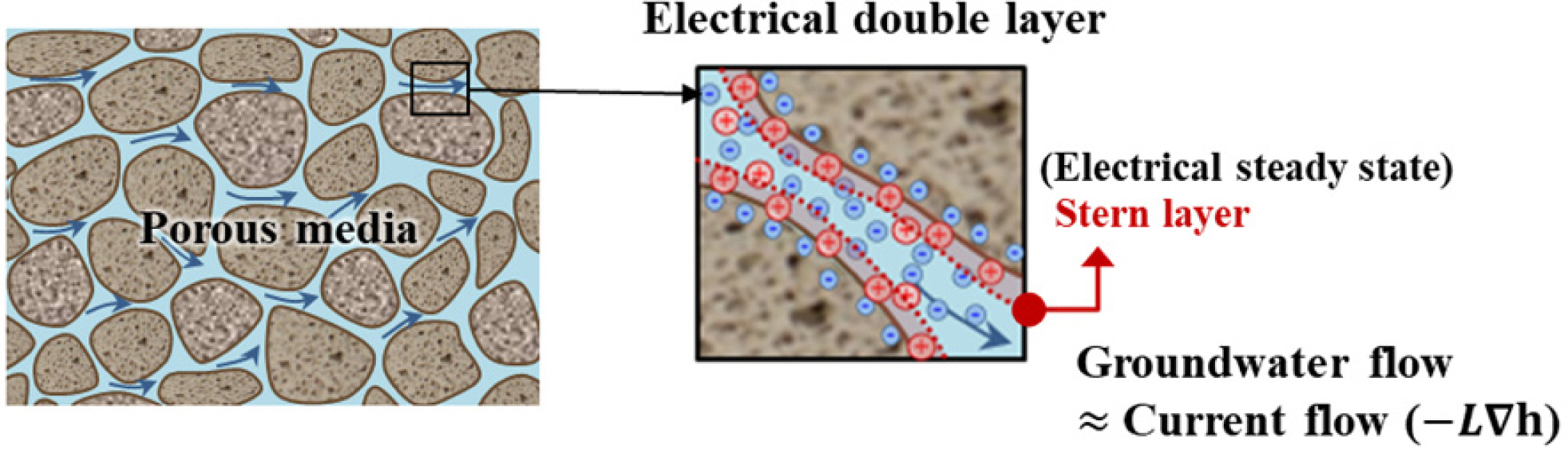 로 설명할 수 있으며, 이때 u는 Darcy velocity [m/s], k0는 다공성 매질의 고유 유체 투수율(intrinsic permea- bility) [m2], ηf는 공극수의 동적 전단 점성(dynamic shear viscosity) [Pa·s]이다. 위 두 식에서의 수리전기적 결합 항들은 모두 흐름 전위와 전기 침투(electro-osmosis)와 같은 계면 동전 현상(electrokinetic phenomenon)을 설명한다. 계면 동전 현상은 지하의 미세한 입자 및 다공질 매질 표면이 대전되어 있을 때 공극수 내 이온이 매질 표면에 흡착 및 대전하여 전기적 이중층을 형성하고 전기적 평형 상태가 되는데 이 때 중력장 혹은 전기장에 의해 발생하는 현상들을 모두 포함한다. 전기 침투는 전기장에 의해 다공성 매질 내의 유체가 흐르는 현상으로 흐름 전위와 반대되는 개념이다. 식 (1)의 우항 -L(∇p - ρ/g)는 흐름 전류 밀도, js를 나타내며, 식 (2)의 첫 항 -L∇φ는 전기 침투 현상을 설명한다.