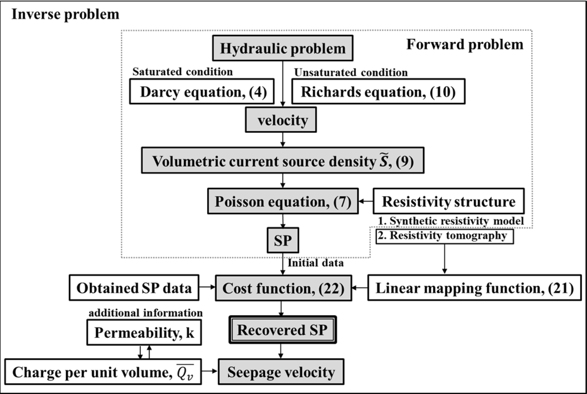 Fig. 2 A flowchart of forward modeling of streaming potential and inversion of self-potential (SP) survey data (modified from Bolève et al., 2009). |