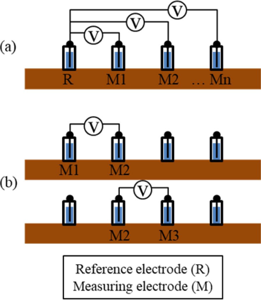 Fig. 3 Schematic diagrams of electrode array methods for SP survey: (a) fixed-based method and (b) leap-frog or gradient method. |