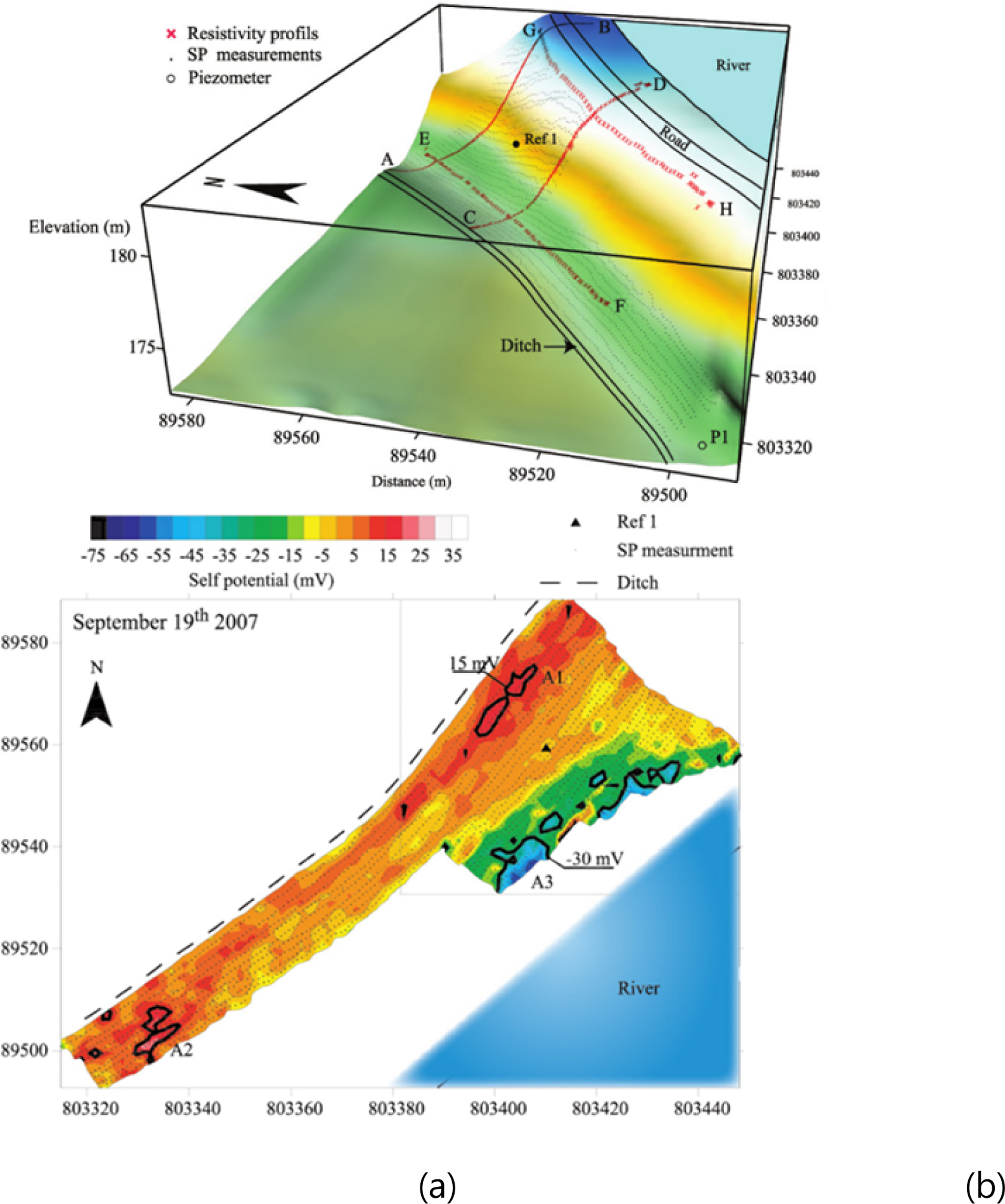 Fig. 4 SP and electrical-resistivity surveys in an embankment along Rhone River in France (Bolève et al., 2009): (a) electrodes positions for both surveys (a total of 2076 electrodes were installed from the crest to the ditch of the dam while the reference electrode (Ref 1) is located in the middle of the slope) and (b) measured SP distribution (three SP anomalies are labeled A1, A2 and A3, and a filled triangle is the position of Ref 1 of (a)). |