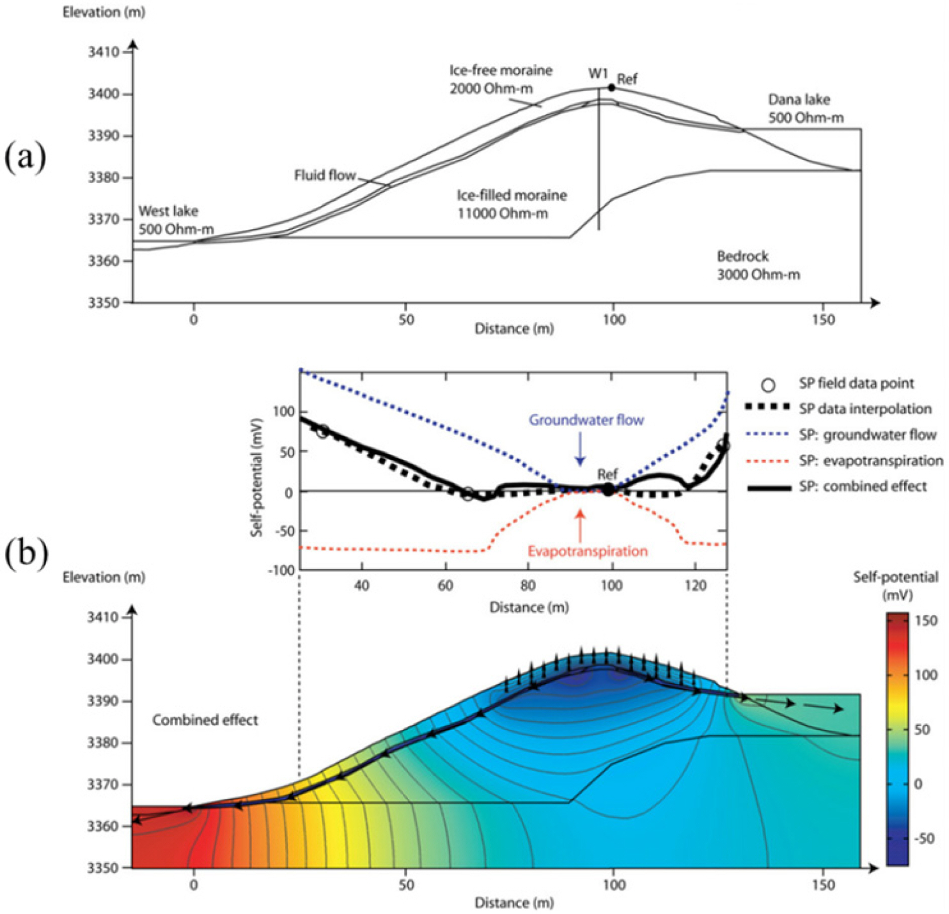 Fig. 5 Results of numerical modeling of the effects of stratigraphy as well as groundwater flow on streaming potential data: (a) a schematic cross-section of the model, whose stratigraphy interpreted from field studies and resistivity soundings, with estimated bulk resistivity of each unit (a black dot is the position of reference electrode while groundwater travels along the contact between ice-filled and ice-free moraines) and (b) a cross-section of simulated SP distribution along the profile at the surface in (a) (Moore et al., 2011). |