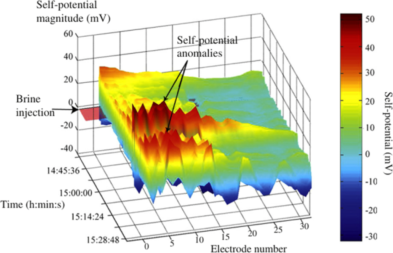한편 흐름 전위가 유체의 NaCl 농도 증가에 따라 선형적으로 증가한다는 실험 결과에 따라, 지하수의 염도의 변화를 주어 이에 따른 누수 영역에서의 흐름 전위 변화를 관측하여 누수 영역을 평가한 사례가 있다(Fig. 6)(Bolève et al., 2011). 이에 기초하여 댐에서 추적자시험(tracer test)을 위한 소금물 주입 후의 흐름 전위 자료에서 주입 전 배경 흐름 전위 자료를 제거하여 양의 이상이 나타나는 영역을 누수 영역으로 해석하였다. 누수 영역으로 해석된 영역에서의 전기전도도 변화 자료에서도 뚜렷한 전도도 증가가 나타났다. 위와 같이 흐름 전위 해석 시 주위의 환경을 인위적으로 바꾸어 모니터링을 수행하고 이에 따른 전위 변화를 정성적으로 해석함으로써 누수 영역을 효과적으로 평가할 수 있다.