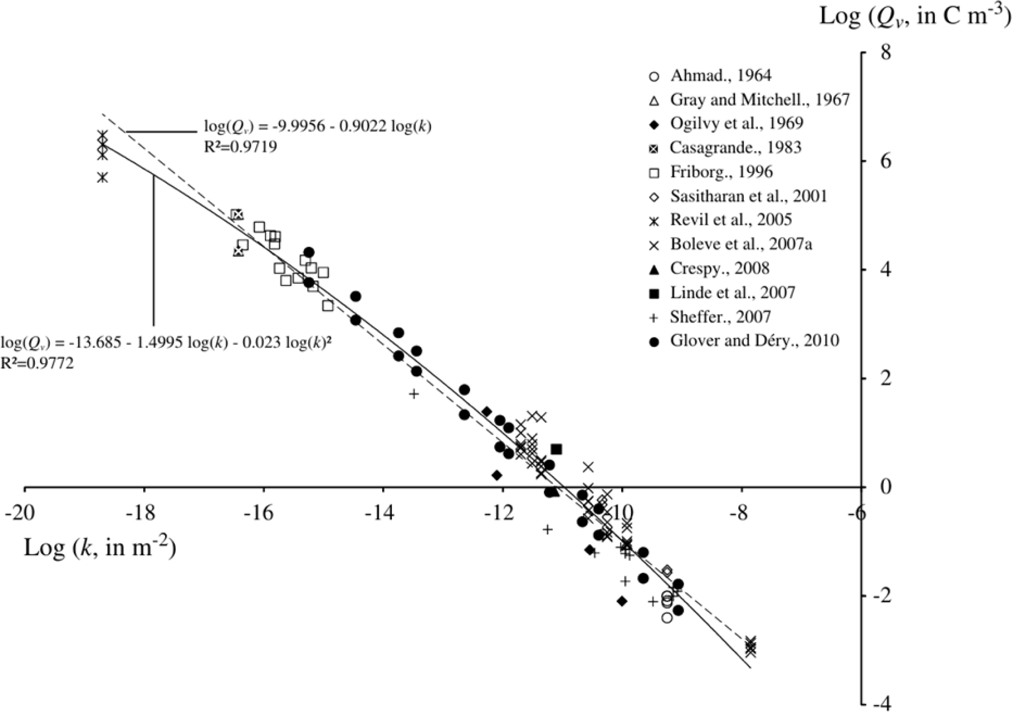 Fig. 7 Experimental relationship between charge densities per unit pore volume and permeabilities in log–log scale. Samples are from a wide variety of porous materials to avoid regional trends (Bolève et al., 2012). |