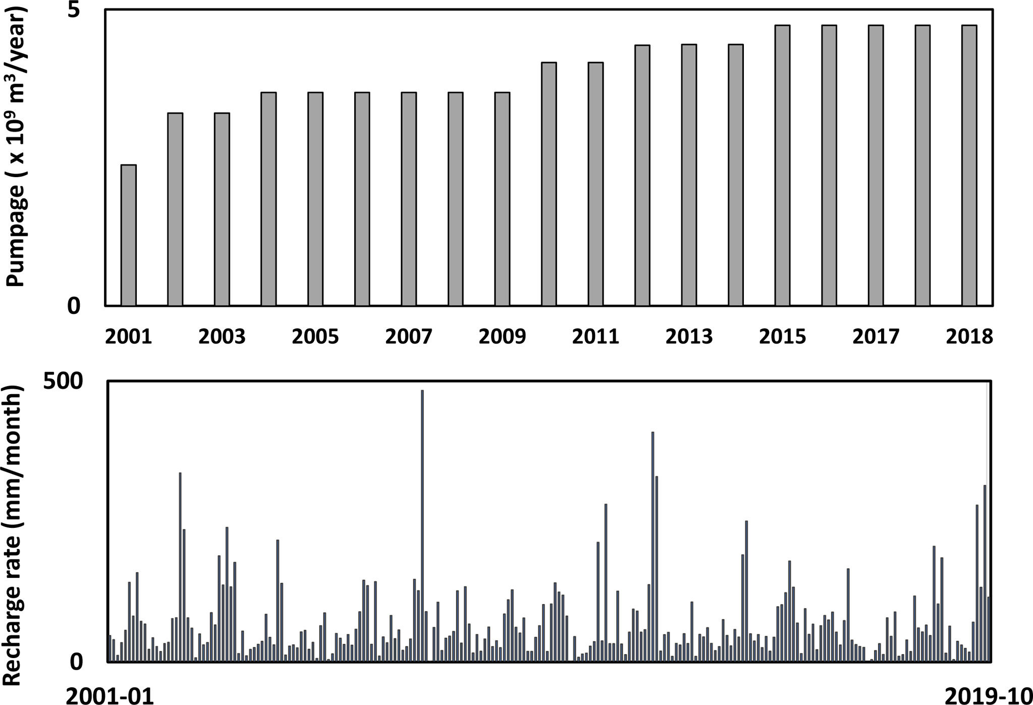 Fig. 2 (a) Permissioned total pumping rate and (b) Estimated monthly areal recharge at the study-site from January 2001 to October 2019 (modified from Chang et al., 2020). |
