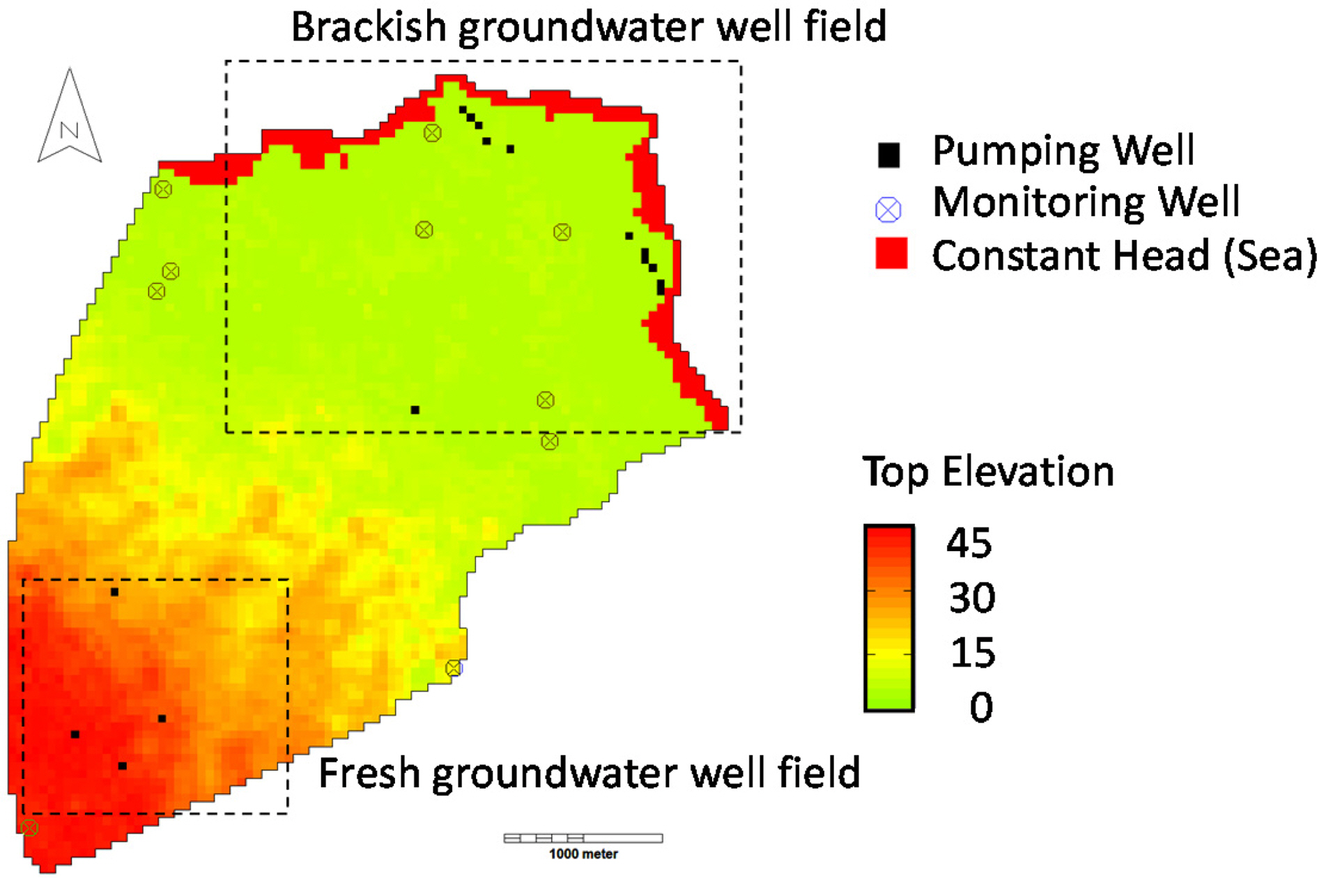 Fig. 3 Boundary conditions and well locations of the study site at eastern Jeju Island. Red represents constant head boundary conditions describing ocean, black cells represent freshwater pumping wells and brackish water pumping wells, and circles represent monitoring wells (modified from Chang et al., 2020). |
