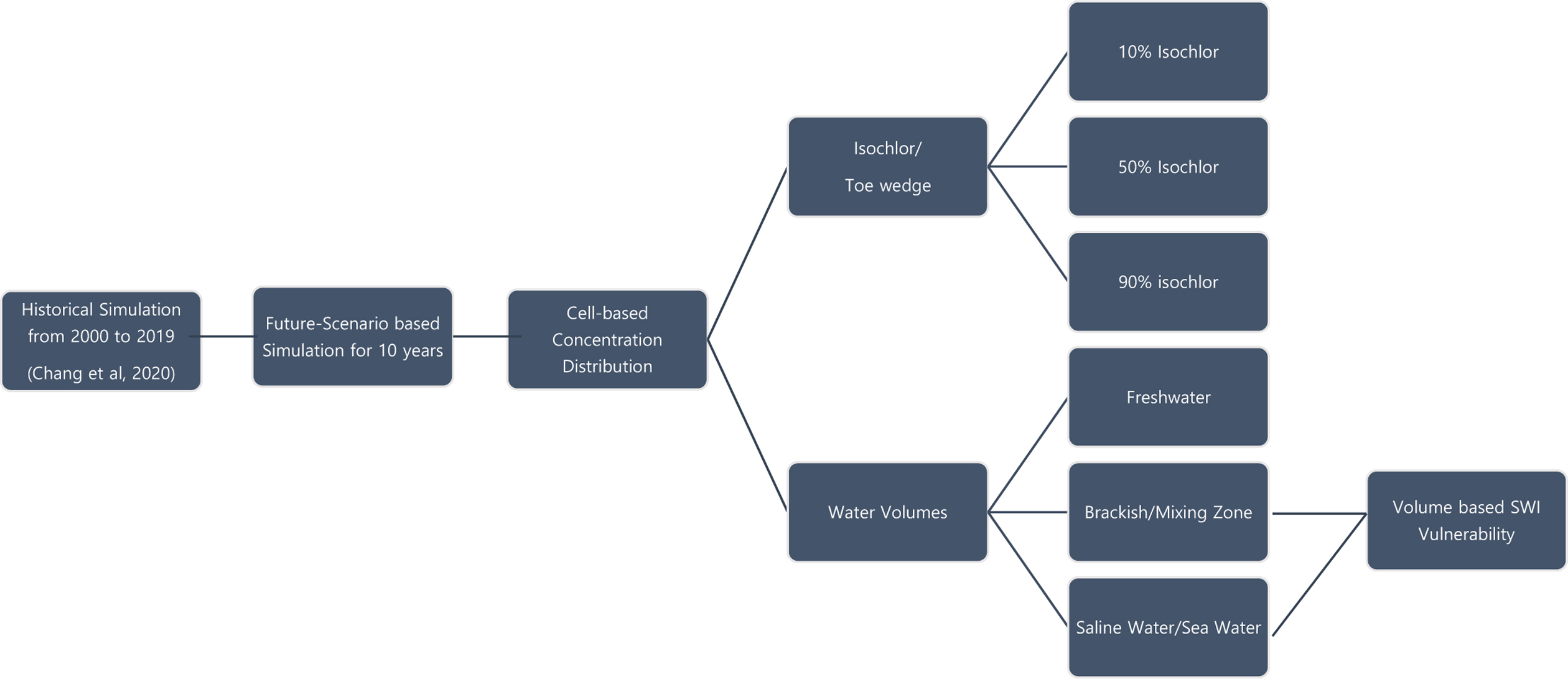 Fig. 4는 SEAWAT 모의결과를 바탕으로 한 동역학적 해수침투 지표 산정 프로세스를 보여준다. Chang et al. (2020)은 개발 전 기간의 시뮬레이션 결과를 초기 조건으로 하여 2000년부터 2019년까지 지하수 개발에 따른 해수침투 변화를 모의하고 동일 모델에서 모델 검‧보정 위해 시변성 모의 결과와 7개의 해수침투 관측정에서 얻은 지하수 모니터링 데이터를 비교한 결과, 지하수위 및 염분 농도의 모의결과와 관측치가 높은 일치율을 보여주었다. 해수침투의 정량적 지표에는 담염수 경계면의 위치, 해안으로부터의 담염수 경계면의 거리, 해안지하수 유출량, 해안지하수 부존량 등이 있다. 가장 일반적인 담염수 경계면은 해수 농도의 50%를 기준으로 하는 연결선 및 연결면을 의미한다. 10% 및 90%의 농도는 담염수 혼합영역을 고려하는 수치 모델에서 50% 기준 외의 해수침투의 추가적 지표로 채택되며, 본 연구에서도 정밀한 부존량 분석을 위해 10%, 50%, 90% 경계면의 분포를 분석하였다. 모의 결과로 도출한 경계면을 이용하여 해안지하수를 담수, 기수, 염수로 구분하였고 미래 예측 시나리오에 따른 각각의 부존량을 계산하였다. 마지막으로 해안지하수 중 기수 및 염수 부존량을 중심으로 Werner et al. (2011)가 제시한 동적 취약성 지표 중 하나인 부피 중심의 해안지하수 취약성 평가(volume-based SWI vulnera- bility)를 진행하였다.