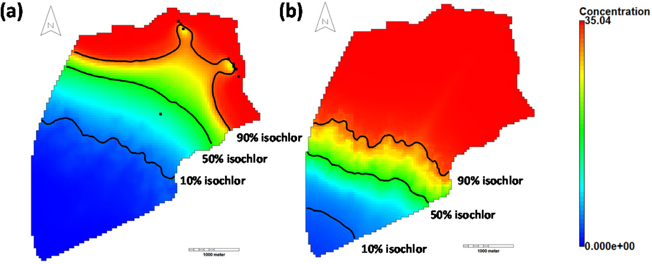 Fig. 5 Plan view of concentration in (a) layer 4 , 40 to 50 m below sea-level and (b) the bottom layer, 80 to 95 m below sea-levelat the initial time of the future-scenario based simulation in October 2019. Salt concentrations range from 0.0 (blue) to 35 kg/m3 (red). Black dots represent brackish pumping wells. Black lines represent 10%, 50% and 90% isochlors. |