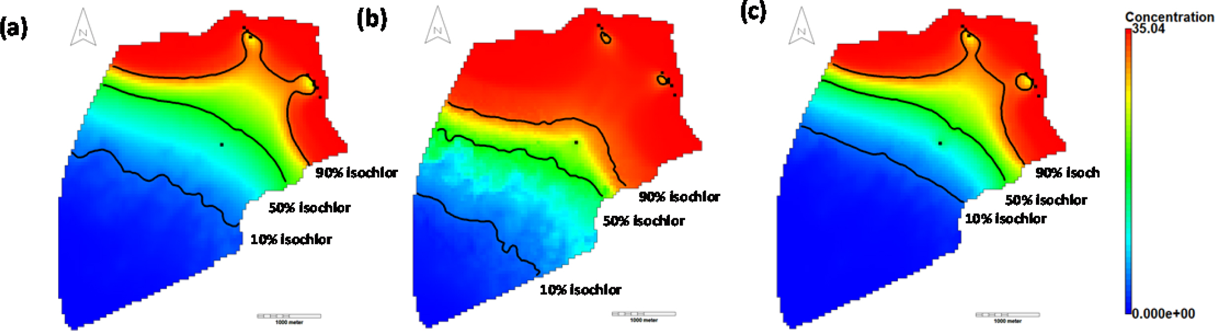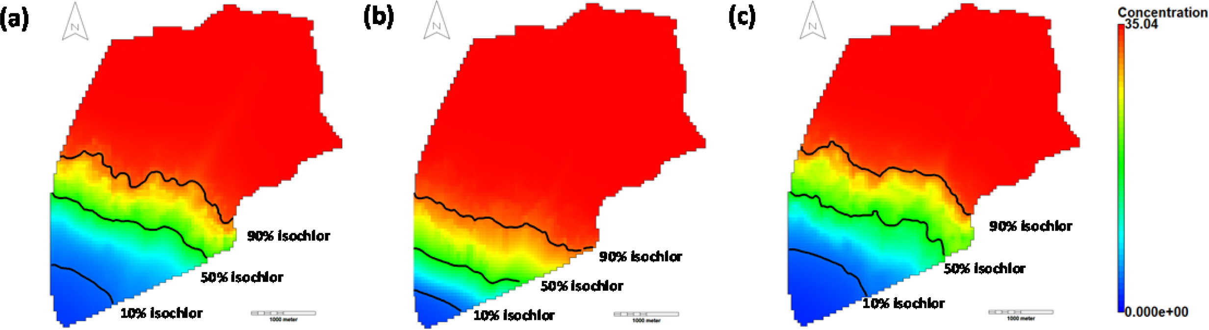 Fig. 6 Plan view of concentration in layer 4 at the end of the future-scenario based simulation for (a) base case, (b) dry-climate, and (c) wet-climate. Salt concentrations range from 0.0 (blue) to 35 kg/m3 (red). Black dots represent brackish pumping wells. Black lines represent 10%, 50% and 90% isochlors. |