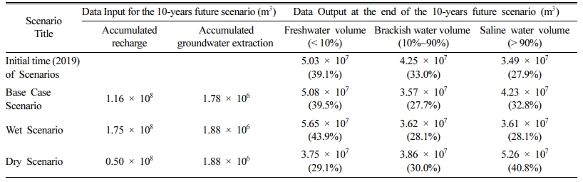 시나리오 초기 조건에 의해 계산된 담수의 양은 5.03 × 107 m3로서 전체 대수층 내 지하수 부피의 39.1%를 차지한다. 또한 2019년에 파악된 기수 및 염수의 양은 4.25 × 107 m3, 3.49 × 107 m3로서 전체 대수층 내 지하수 부피의 33.0%, 27.9%를 차지한다. 초기 조건 이후 10년 동안의 기존 지하수 함양량이 유지되었을 경우 담수 및 염수 부피는 각각 5.08 × 107 m3 및 4.23 × 107 m3로 증가했으며, 기수의 부피는 3.57 × 107 m3로 감소했다. 이 결과로부터 해당 대수층의 혼합대가 꾸준히 줄고 있음을 알 수 있다. 초기 조건 이후 10년 동안의 기존 지하수 함양량이 증가하였을 경우 담수 및 염수 부피는 각각 5.65 × 107 m3 및 3.61 × 107 m3로 증가했으며, 기수의 부피는 3.62 × 107 m3로 계산되었다. 특히 담수의 부존량이 초기 조건보다 증가하여 실제 사용 가능한 담수가 증가한 것으로 추론할 수 있다. 반면 크게 증가한 지하수 함양에도 불구하고 기수의 부피는 상대적으로 적게 늘어난 것을 알 수 있어, 기수의 영역은 염지하수 관정의 위치 및 개발량에 영향을 받는 것으로 추론할 수 있다. 초기 조건 이후 10년 동안의 기존 지하수 함양량이 감소하였을 경우 담수 및 기수의 부피가 각각 3.75 × 107 m3 및 3.86 × 107 m3로 감소했으며, 다른 시나리오들과 달리 염수의 부피가 5.26 × 107 m3로 증가하였고 해당 대수층의 40.8%를 차지하였다.