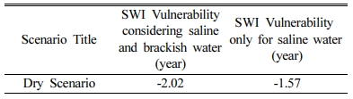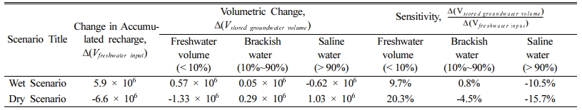 Table 4에서는 민감도 분석과 유사한 방식의 해수침투 지표를 채택하여 두 시나리오에 대해 다시 비교해결과를 제시하였다. 지하수 함양량 대비 해수의 부존량 변화는 Werner et al.(2011)가 정의한 정량적 해수침투 취약성 평가 지표에 해당한다. 괄호안의 값은 식 (1)의 정의에 따라 계산된 부피 기반 해수침투 취약성이며 단위는 year [T] 이다.