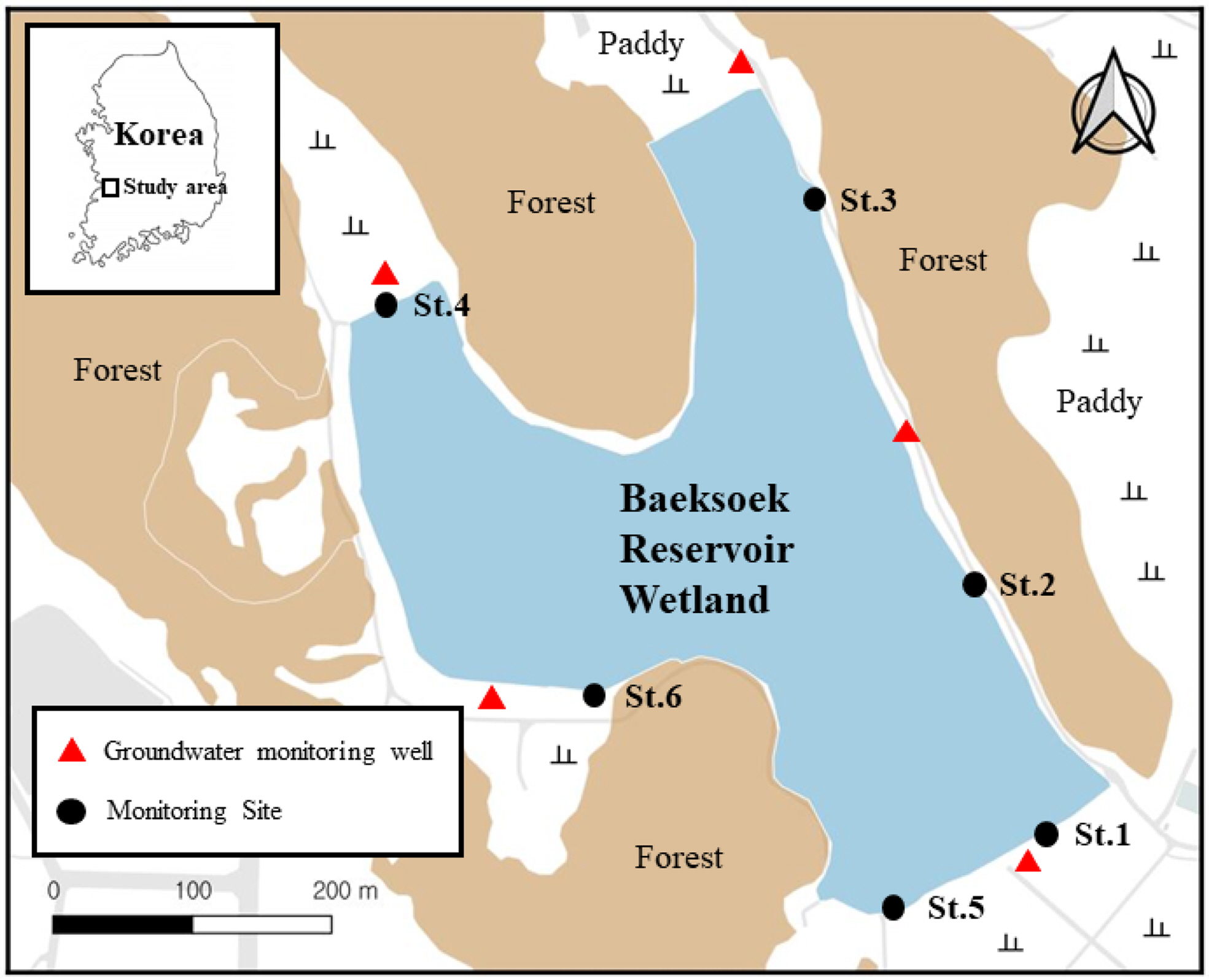 Fig. 1 Locations of monitoring sites for benthic macroinvertebrates and groundwater monitoring wells in Baekseok Reservoir Wetland. |