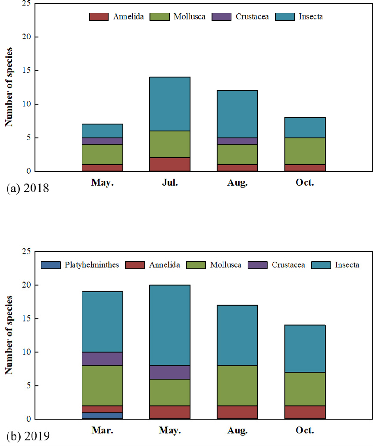 저서성대형무척추동물의 분류군별 출현종수(Fig. 2)는 2018년도에 7~14종, 2019년도에 14~20종으로 확인되었으며, 2018년도 7월에 14종, 2019년 3, 5월에 각각 19, 20종으로 가장 다양하게 출현하였고, 전체적으로 2019년도에 종수가 증가하였다. 다만, 2018년 5월에서 8월 사이에는 종수가 7종에서 12종으로 증가하였으나 2019년에는 19종에서 15종으로 감소를 하는 경향을 보였는데, 2018년도 5월 습지 하부 St.5 지점의 조사 불능으로 인하여 출현 종수 산정이 진행되지 못한 것과 2019년도 St.6 지점의 추가로 인한 조사 지점 수의 차이로 인한 것으로 판단된다.