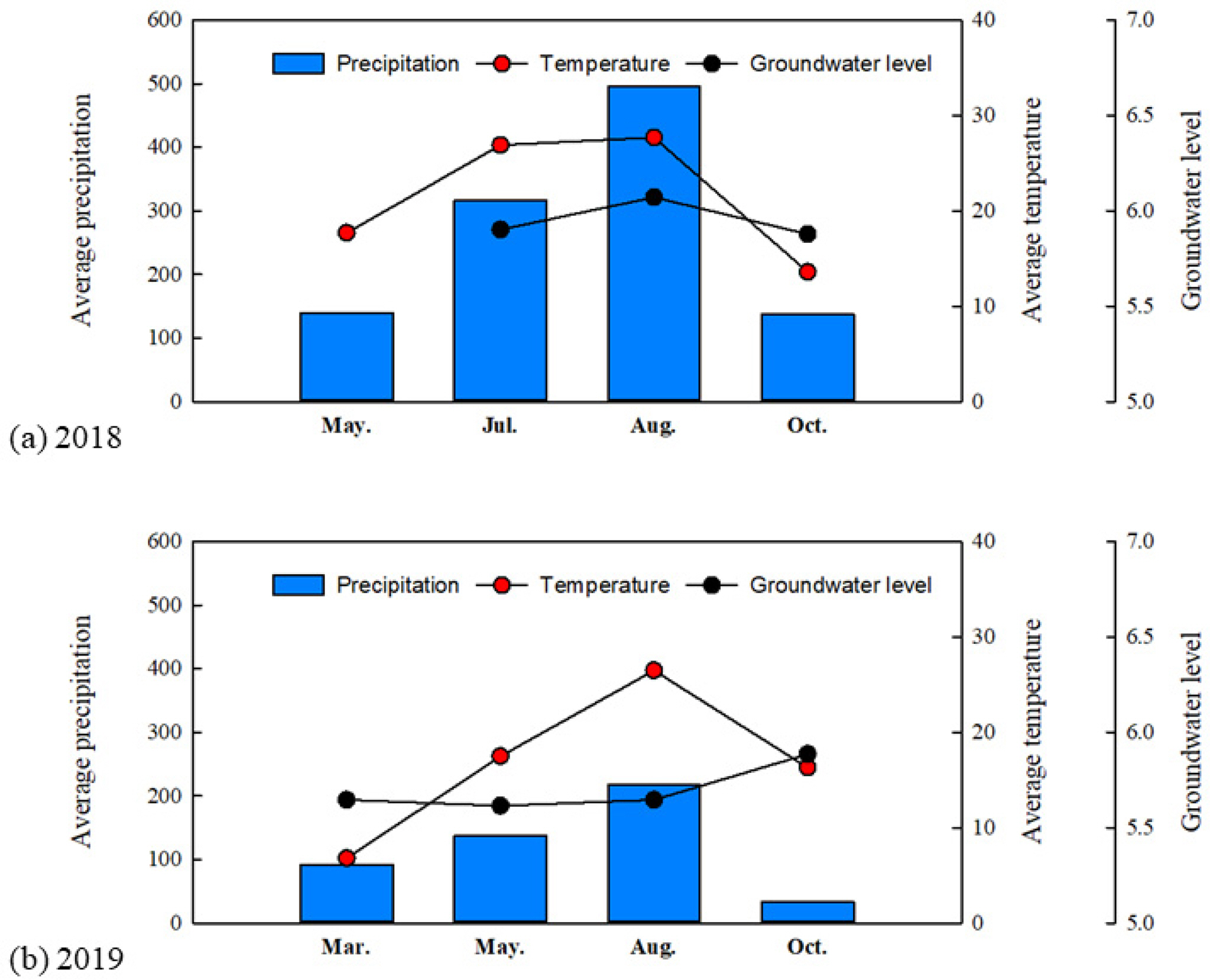 Fig. 3 Average precipitation, temperature and groundwater level of study area. |