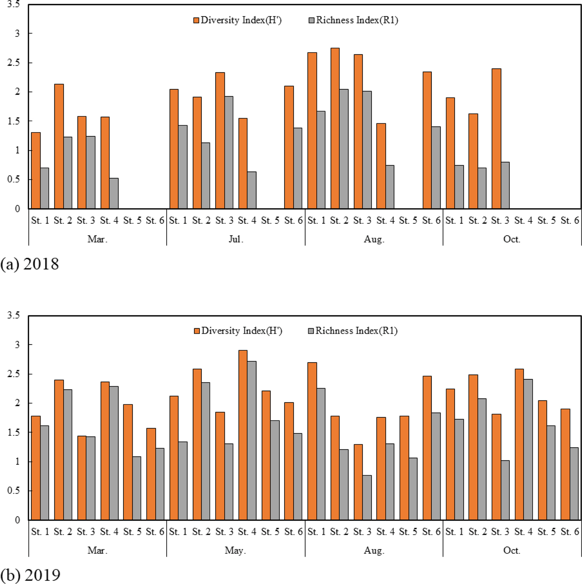 반면, 지점별 다양도지수(H')는 2018년도 St.3 지점에서 1.58~2.64로 높게 나타났고, 2019년도에는 St.2, 4지점에서 각각 1.29~1.85, 1.76~2.9로 가장 높게 나타났다. 종풍부도지수(R1)는 2018년도 St.2, 3 지점에서 각각 0.7~ 2.04, 0.8~2.01로 높게 나타났고, 2019년도에 St.2, 4지점에서 각각 1.21~2.35, 1.3~2.72로 높게 나타났다. 군집지수의 종합 평가 결과, St. 2, 3, 4에서 뚜렷한 차이를 보여 계절적인 특성과 별개로 공간적인 환경 특성이 출현종과 군집지수를 결정하는 것으로 사료된다.