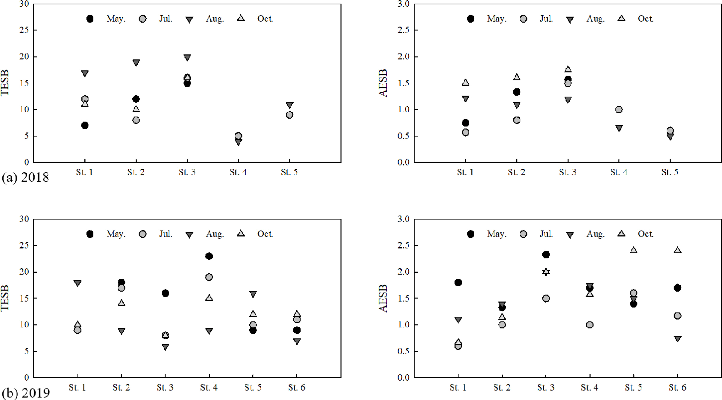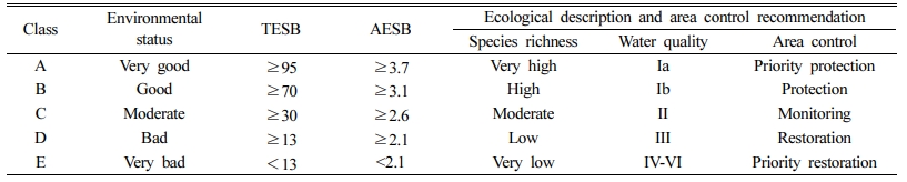 종별 출현 개체수 비를 고려하는 지수와 달리 종수만을 고려하는 TESB 지수는 표본크기(sample size)가 커지면 더불어 그 값이 증가하는데, 이는 환경상태에 대한 평가에 있어서 해석이 달라질 수 있으며 자연적으로 서식처가 단순한 수환경에서는 값이 대체로 지수값이 작은 경향이 있다(Kim et al., 2013). 이러한 문제점을 보완하기 위해 환경질 점수를 평균한 AESB 지수는 하천의 여러 환경요인 중 수질상태를 판정하는데 더욱 유용할 수 있어 본 조사에서는 TESB 지수와 AESB 지수를 복합적으로 이용하였다(Kong et al., 2018).