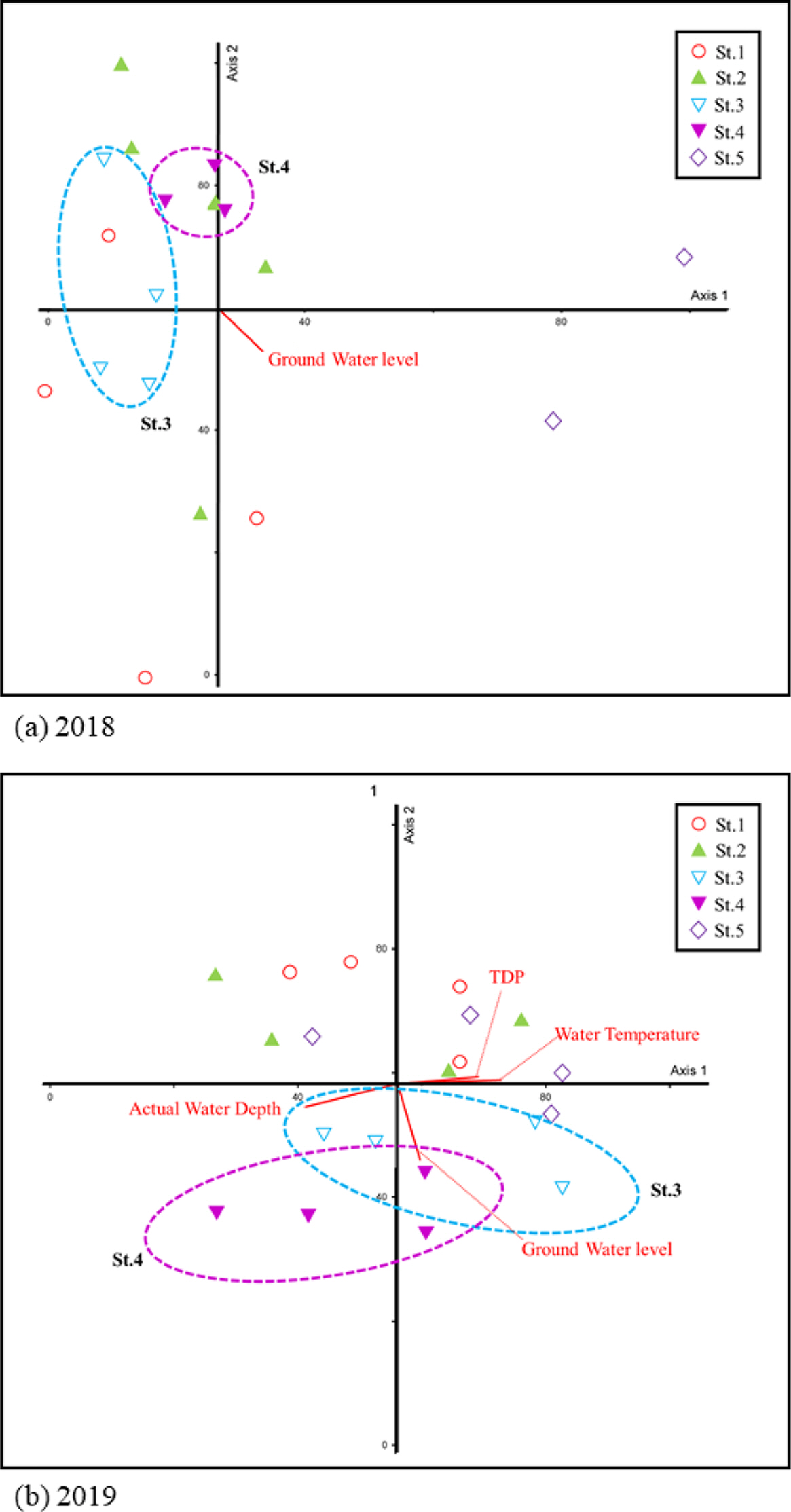 각 지점에서 채집된 종과 개체밀도 데이터를 활용하여 환경인자들과의 상관성에 대해 다변량통계분석을 수행하였고, 각 지점에서 채집된 종과 개체밀도 데이터를 지점별로 시각화하였다(Fig. 6). 그 결과, 특정한 분포 양상을 보였는데, 2018년도 조사시 백석제 북서측 St. 3, 4 지점에서 클러스터를 형성하여 다른 지점과 구분되는 것으로 분석되었으나 종 조성에 영향을 미치는 특정 환경 요인은 파악되지 않았다. 2019년도 조사 시에도 동일한 St.3, 4 지점에서 클러스터를 형성하였는데, St.3, 4 지점은 지하수 수위가 저서성대형무척추동물의 종 조성에 영향을 미치는 것으로 평가된다.
