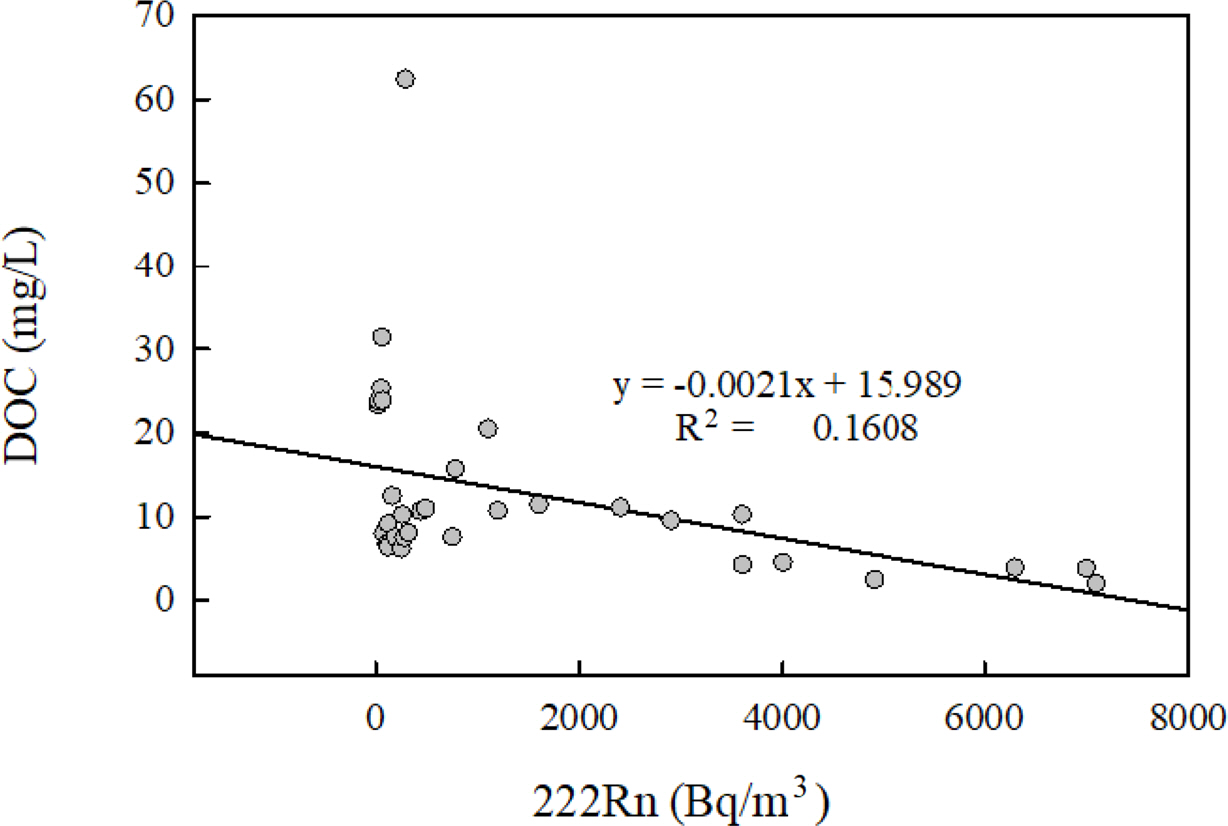 Fig. 7 Correlation between 222Rn concentration (Bq/m3 ) and dissolved organic carbon concentration (mg/L) in wetland surface water. |