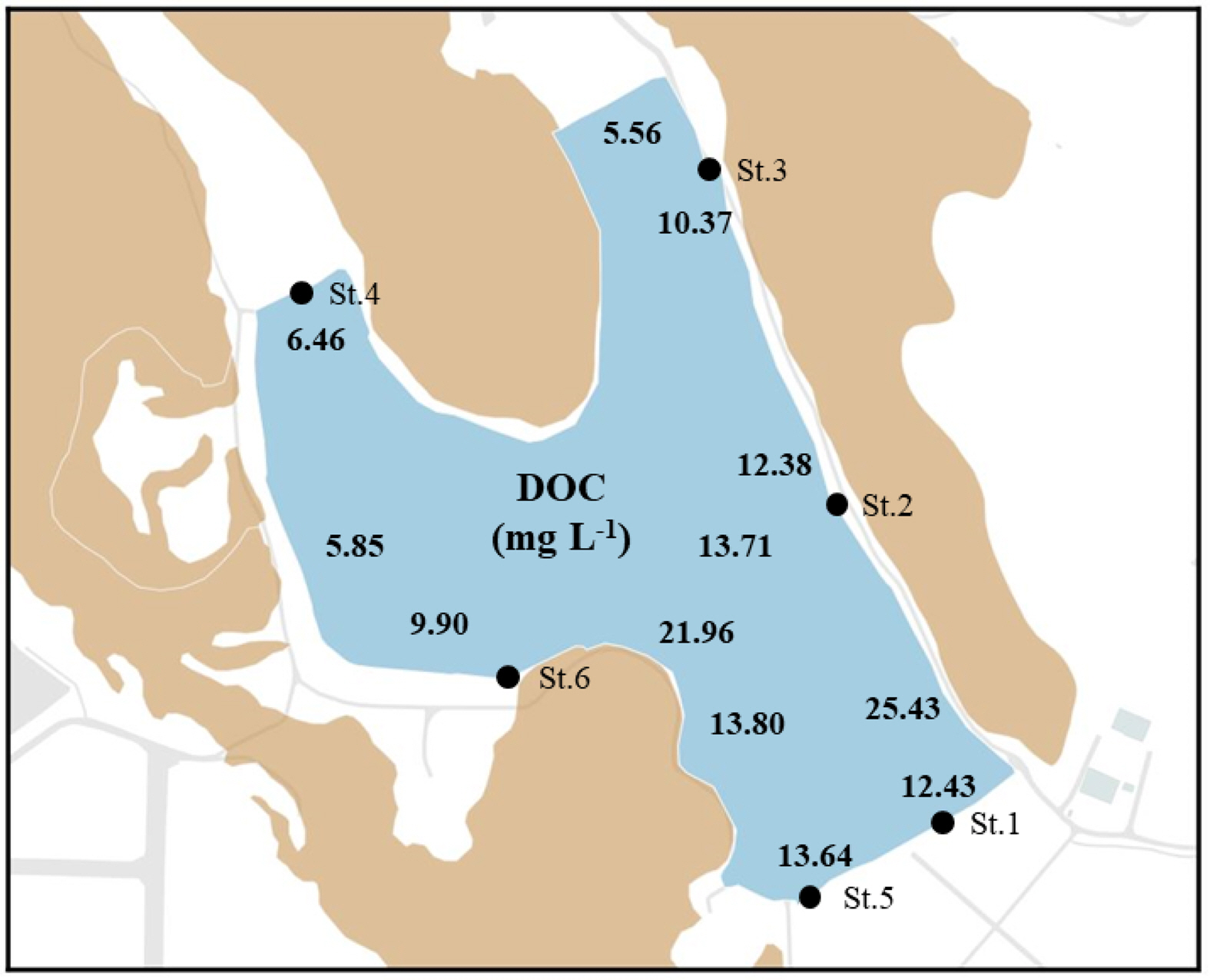 Fig. 8 Spatial distribution of average DOC concentration (mg/L) in Baekseok Reservoir Wetland. |
