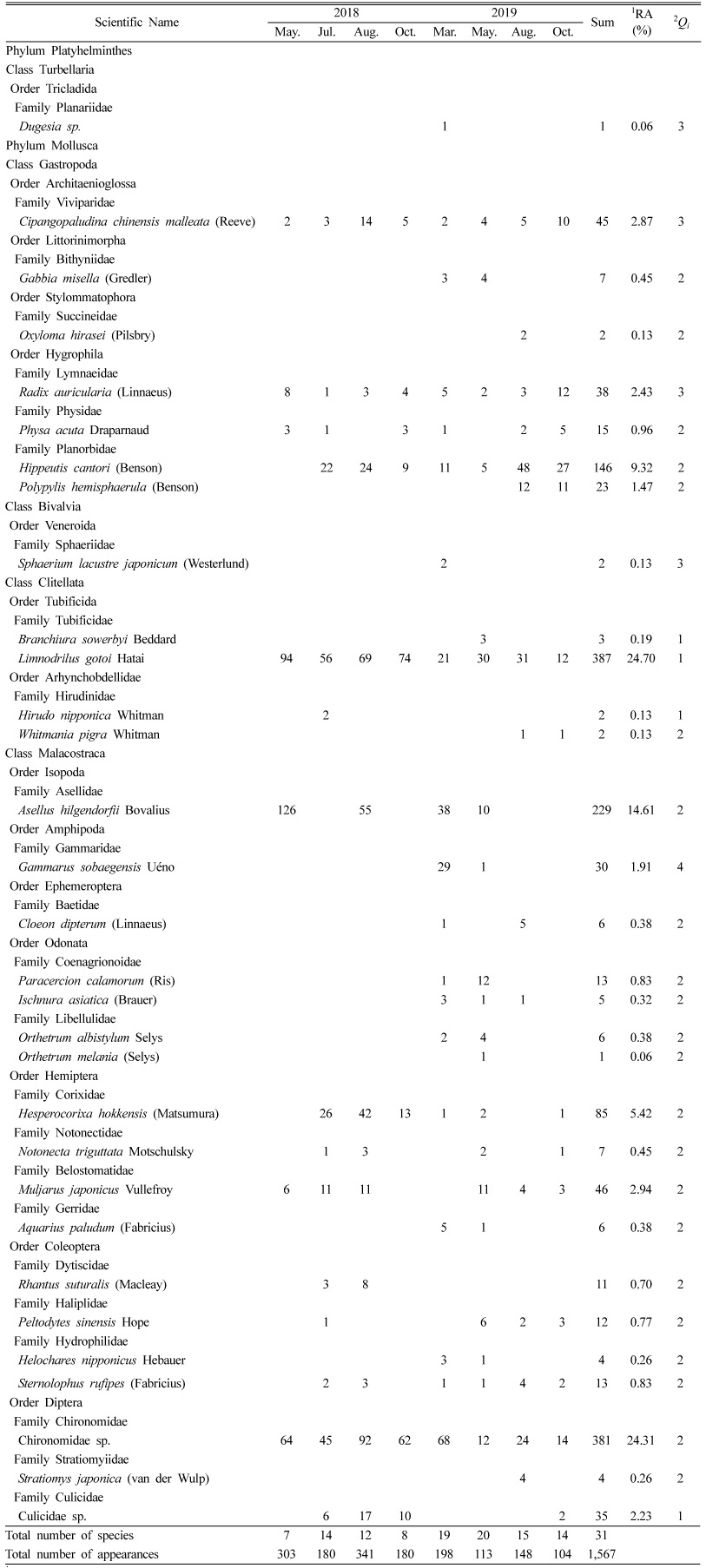 총 8회의 조사 결과 백석제 습지에서 저서성대형무척추동물은 총 4문 6강 15목 25과 31종 1,567 개체/m2가 채집·구분·집계되었다(Table 2). 개별 출현종에 대한 점유율을 나타내는 상대풍부도(RA : Relative Abundance)와 개별분류군에 대한 환경질 점수(Qi)를 종합적으로 고려한 결과, 백석제 습지는 전반적으로 유량이 적고 모래 및 진흙 저질의 퇴적물로 이루어져 대부분 물이 고이거나 유속이 느린 논, 물웅덩이 및 연못과 같은 정수지역에 서식하는 연체동물문(Mollusca)의 논우렁이(Cipangopaludina chinensis malleata), 물달팽이(Radix auricularia), 왼돌이물달팽이(Physa acuta), 수정또아리물달팽이(Hippeutis cantori)와 오염수역을 대표하는 지표생물로 환경질 점수(Qi)가 1점대로 낮은 환형동물문의 실지렁이(Limnodrilus gotoi), 절지동물문(Arthropoda) 곤충강(Insecta)의 깔따구류(Chironomidae sp.) 등이 계절에 상관없이 상시 출현하였다.