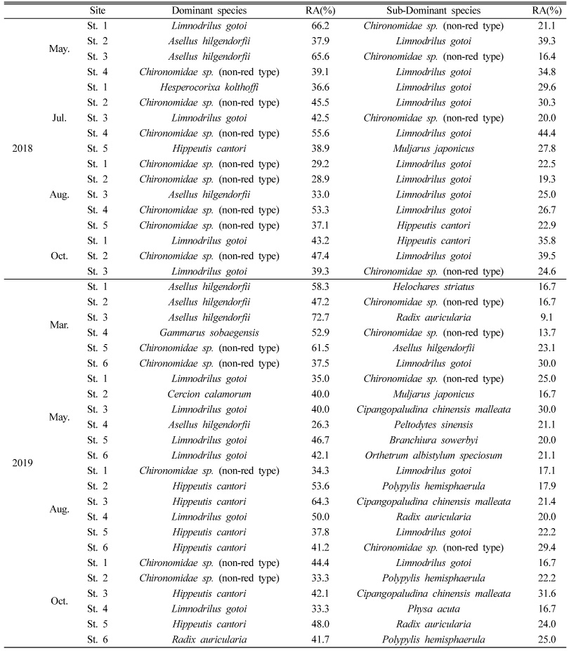 저서성대형무척추동물의 우점종(dominant species)과 아우점종(sub-dominant species)의 상대풍부도(RA)을 살펴보면(Table 3) 조사 시기 및 지범별로 다소 차이가 있으나, 대부분의 지점에서 실지렁이(Limnodrilus gotoi)가 17.1~ 66.2%로 우점종, 깔따구류(Chironomidae sp.)가 16.7~ 55.6%로 아우점종을 나타냈으며, 그 외에는 물벌레(Asellus hilgendorfii)와 수정또아리물달팽이(Hippeutis cantori) 등이 주로 출현 하는 양상을 보였다. 이에 따라 저서성대형무척추동물 군집구조는 전반적으로 단순하고 우점종을 중심으로 특정 분류군에 의한 의존도가 매우 높은 것으로 판단된다.