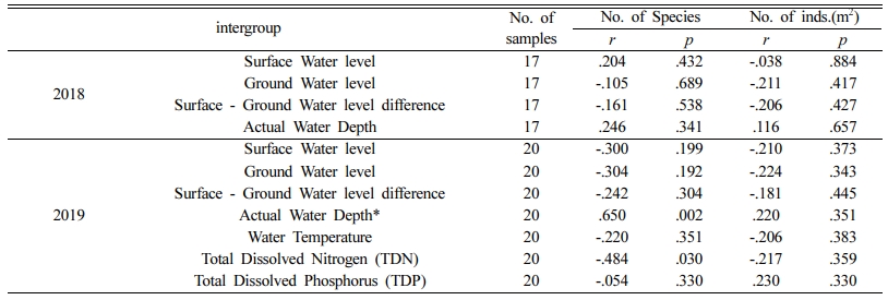 2018년도 저서성대형무척추동물의 출현종수 및 개체밀도와 습지 수위, 지하수 수위, 지하수-습지 수위차 및 지점별 실측수심 간에 상관성은 유의확률(p-value)이 모두 0.05보다 큰 것으로 분석되어 통계적으로 유의하지 않은 것으로 판단되었다. 2019년도 저서성대형무척추동물의 출현종수는 지점별 실측수심(상관계수: 0.650, 유의확률: 0.002)이 양의 상관관계, 총용존질소(TDN)(상관계수 : –0.484, 유의확률 : 0.030)가 음의 상관관계를 보였고 지하수 수위, 습지 수위, 지하수-습지 수위차, 수온 간의 상관성은 유의확률(p-value)이 모두 0.05보다 큰 것으로 분석되어 통계적으로 유의하지 않은 것으로 판단되었다.