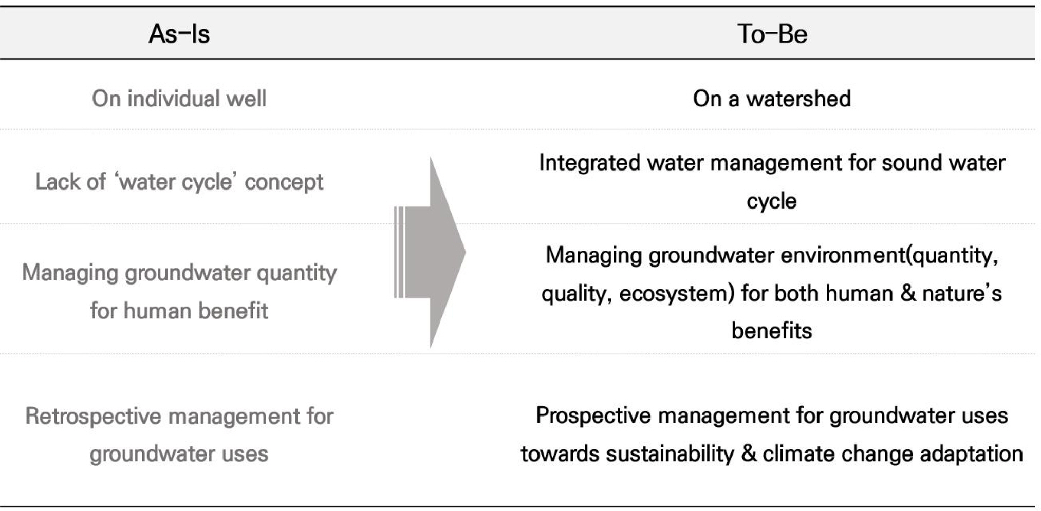 현행 지하수 관리는 인간의 지하수 이용과 그와 관련된 수질이 주요 관리범위다. 물의 공공성과 수생태 환경의 보전, 인간과 자연과의 물의 배분 등을 물관리 정책기조를 고려했을 때 지하수 관리를 ‘생태계’ 를 포함하는 환경으로 관리범위의 확대가 필요하다. 이는 그간 인간 중심의 지하수 관리를 벗어나 인간과 자연의 공존을 위한 지하수환경 관리를 새로운 지하수 관리 패러다임으로 제안한다.