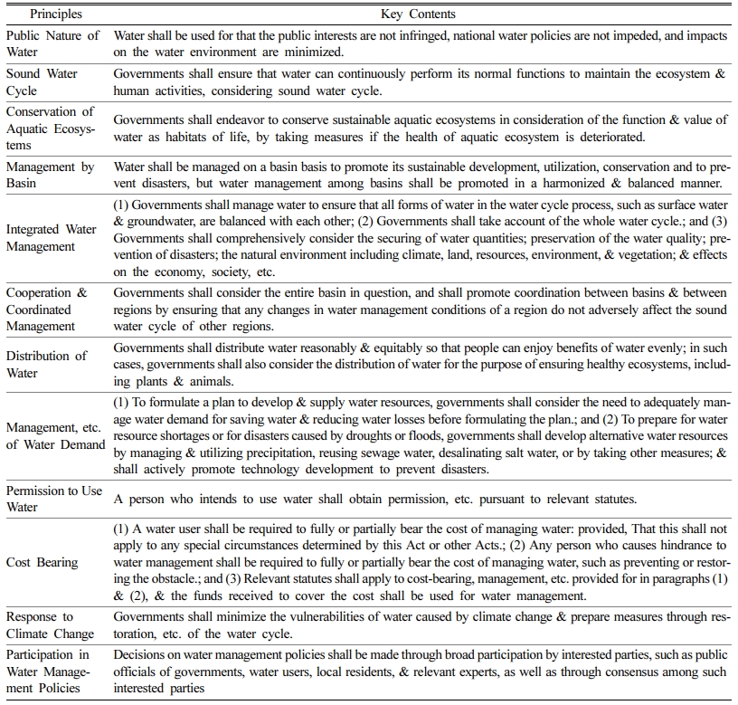 물관리기본법에는 물의 공공성, 건전한 물순환, 수생태환경의 보전, 유역별 관리, 통합 물관리, 협력과 연계 관리, 물의 배분, 물수요관리, 물 사용의 허가, 비용부담, 기후변화 대응, 물관리 정책 참여 등 12가지 부문에 대한 국가 물관리 기본원칙을 규정하고 있다(Table 1). 관계 부처 합동으로 수립된 제1차 국가물관리기본계획은 기후위기, 저성장 시대에 12가지 물관리 기본원칙을 준수하면서 기존 물관리 정책의 한계를 개선하기 위한 향후 10년간의 물관리 비전과 목표, 전략을 제시하고 있다. 제1차 국가물관리기본계획은 각 분야별 물관리 계획을 아우르는 물 관련 국가 최상위 계획으로 물순환 과정에서 빗물,지표수,지하수와 관련된 수질· 수량·수생태, 수재해 관리 뿐만 아니라, 상하수도·하천·댐·저수지 등 물관리 인프라 전체를 아우르는 국가의 모든 물 관련 계획들의 기본이 되는 계획이다(MCJ, 2021). 제1차 국가물관리기본계획에서는 “자연과 인간이 함께 누리는 생명의 물”을 비전으로 삼고, 물관리기본법의 목적과 기본이념에 따라 2030 물관리 총괄목표를 “건전한 물순환 달성”으로 세웠다. 세부목표로 세 가지를 수립하였는데, 첫째 유역 공동체의 건강성 증진, 둘째 지속가능한 물 이용 체계 확립으로 미래 세대 물 이용 보장, 마지막으로 기후위기에 강한 물안전 사회 구축이다. 이를 달성하기 위한 전략을 물환경, 물이용, 물재해, 물정보, 물기반시설, 물산업 및 국제협력 등 6개 부문별로 제시하였다(Fig. 1).