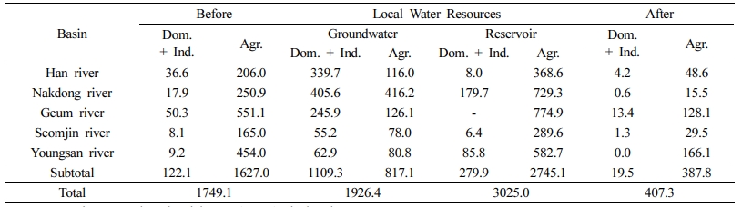 Table 2 Water deficit for domestic, industrial, and agricultural use before and after application of potential local water resources (Hyun et al., 2020) (unit: 106 m3 /yr) |