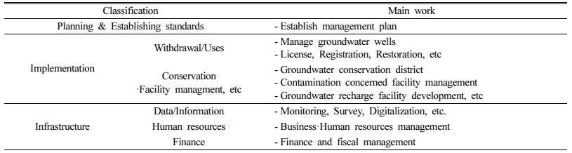 Hyun et al.(2020)은 우리나라 지하수 관리업무를 지하수법에서 규정하고 있는 계획수립, 정책이행, 정책기반의 측면에서 정리하였다. 본 연구에서는 Table 3에서 정리한 업무들을 중심으로 국가와 지자체 차원에서의 관리현황을 검토하였다.