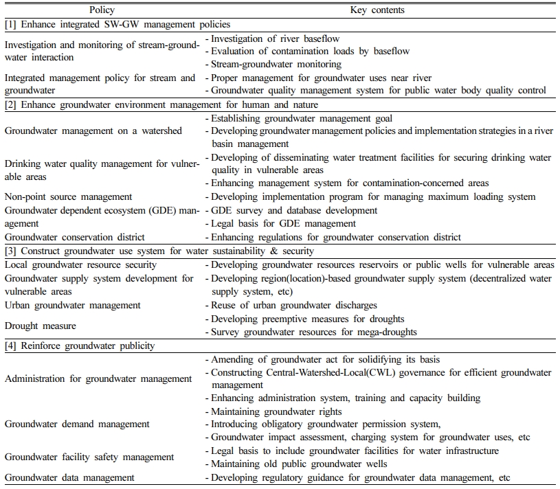 SWOT 분석 결과를 기반으로 다음 네 가지의 지하수 정책방향을 제안하였다. 첫째, 통합물관리를 위한 지표수-지하수 연계관리, 둘째, 물환경의 건강성 증진을 위한 지하수 환경 관리, 셋째, 물 이용의 지속가능성과 기후대응력 강화를 위한 지하수 이용기반 구축, 넷째, 물의 공공성에 입각한 지하수의 공공관리 강화이다. 본 연구에서는 통합 물관리를 위한 지하수 관리의 새로운 패러다임에 맞추어 수자원, 하천, 상하수도, 지하수, 농업용수, 행정, 재정 등 다양한 분야의 전문가들의 의견을 수렴하여 지하수 관리의 정책방향에 부합하는 추진 과제를 Table 4와 같이 도출하였다.