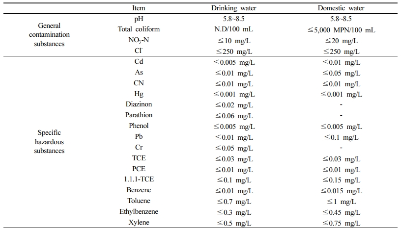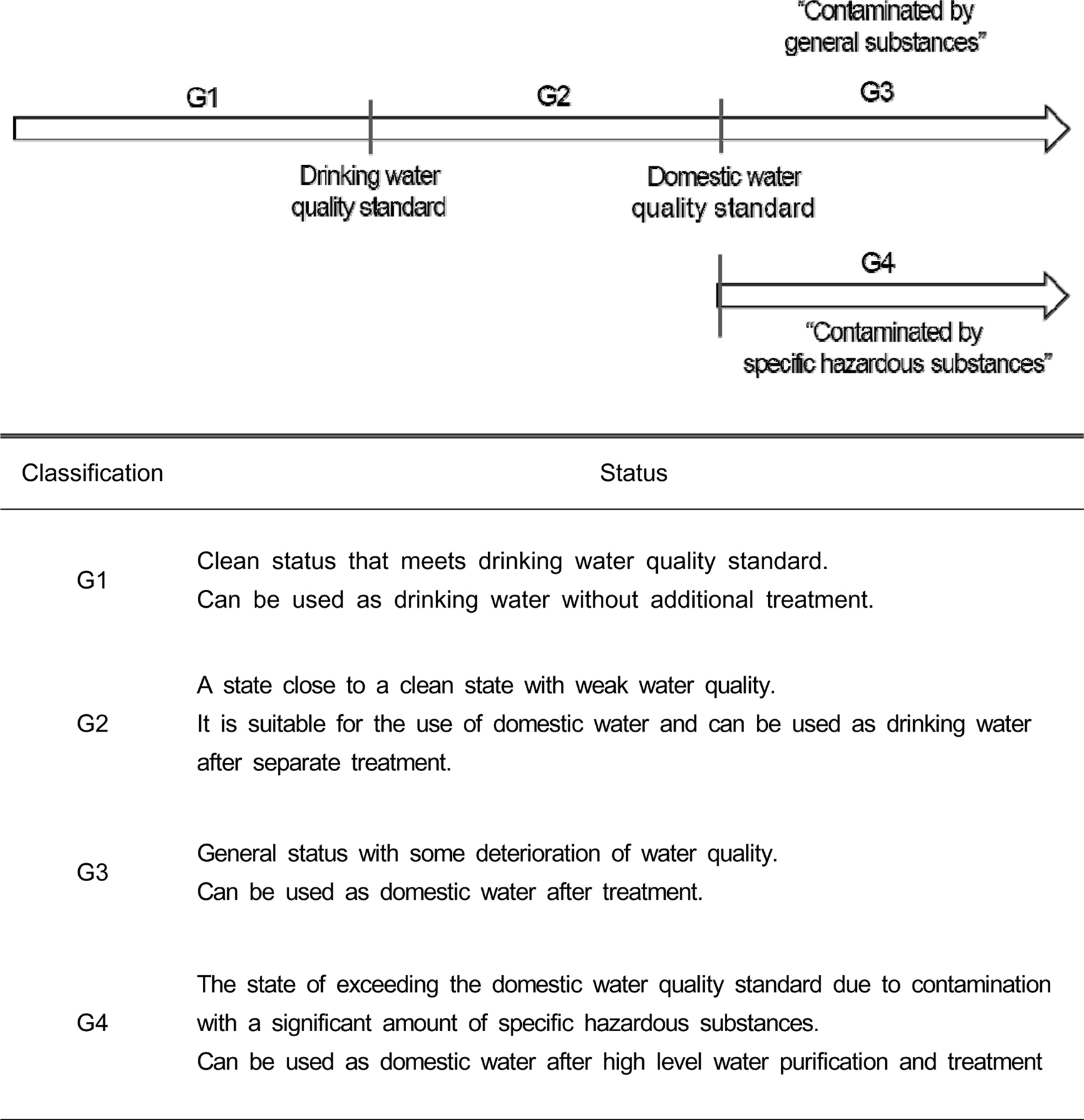 본 연구에서는 지하수의 먹는물 및 생활용수 수질기준(Table 1)을 적용하여 일반오염물질과 특정유해물질의 수질기준 초과 여부에 따라 즉시 음용수로 이용할 수 있거나 정수처리 후 음용수나 생활용수 이용 가능 여부 등을 고려하여 4개의 등급으로 분류하였다(Fig. 1). 1등급(G1)은 먹는물 수질기준을 만족하는 청정 상태로 별도의 처리없이 음용수로 이용할 수 있는 수질 상태 이며, 2등급(G2)은 생활용수 기준을 만족하여 미약한 수질 저하가 있으나 청정 상태에 근접하여 생활용수 사용에 적합하며 별도의 정수처리 후 음용수로 사용할 수 있는 수질 상태로 정의하였다. 3등급(G3)의 경우는 특정유해물질에 대한 생활용수 수질기준은 만족하나 일반오염물질의 경우 수질 저하가 발생하여 생활용수 수질기준을 만족하지 못해 별도의 정수처리 후 생활용수로 사용할 수 있는 수질 상태이다. 4등급(G4)의 경우 상당량의 특정유해물질로 오염되어 생활용수 수질기준을 초과한 상태로 고도의 정수처리나 정화 후 생활용수로 사용할 수 있는 수질 상태로 정의하였다.