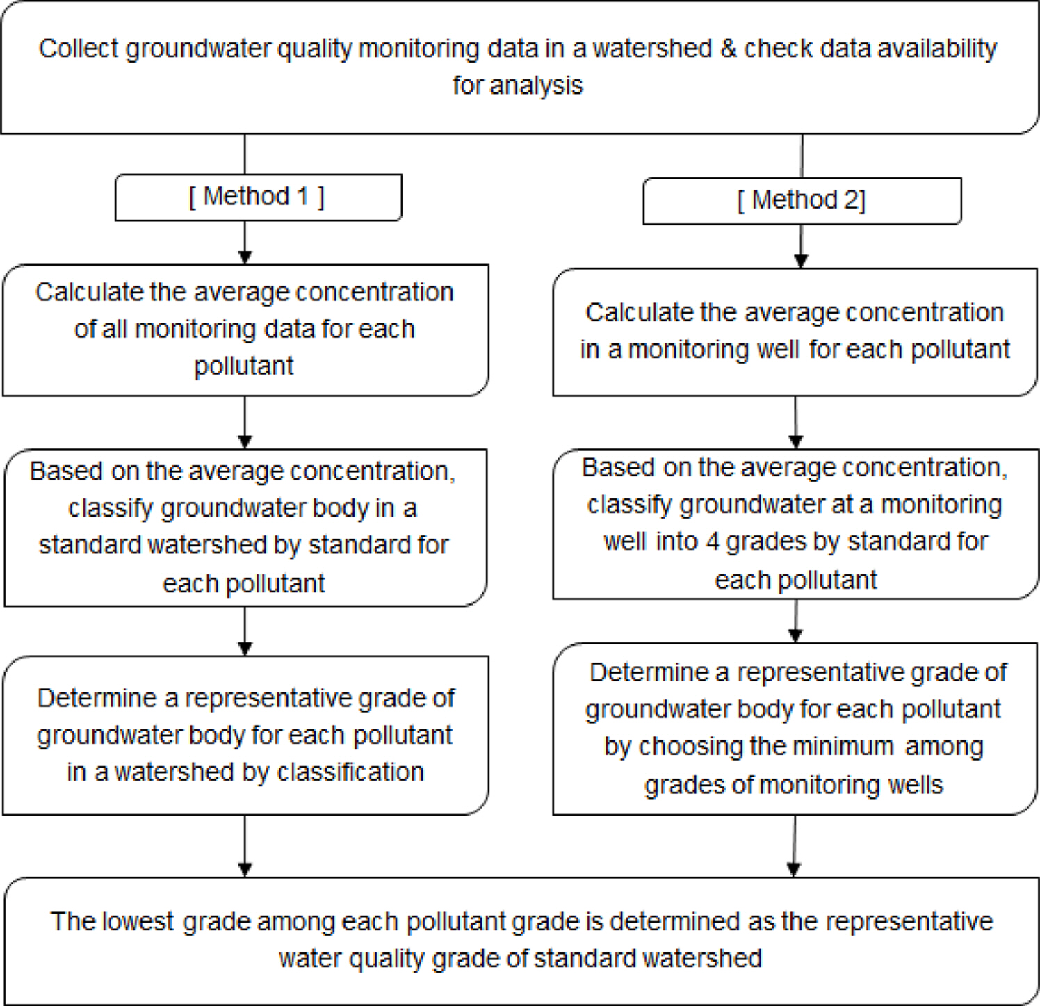 표준유역 내 관정단위 지하수수질측정망 자료로부터 지하수 오염물질별 유역단위 지하수 수질을 평가하기 위하여 두 가지 통계학적 방법을 이용하였다. 첫 번째 방법은 유역 내 측정망자료를 이용하여 해당 오염 물질의 평균 농도를 산정하고 그에 따른 지하수 상태의 등급을 부여하는 방법이다. 두 번째는 유역 내 측정망 지점별 수질등급 중 최저등급으로 유역의 수질 등급을 부여하는 방법이다.