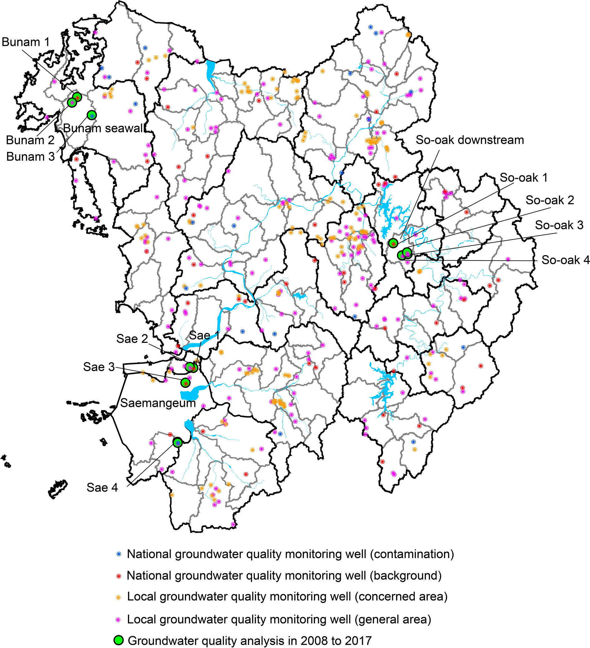 본 연구에서는 유역단위 지하수수질 상태 평가를 수행하기 위하여 2017년 기준 국가지하수수질측정망과 지역지하수 수질측정망 자료 중 질산성질소, 염소이온 및 총대장균군의 반기 및 분기별 측정자료를 이용하였다.