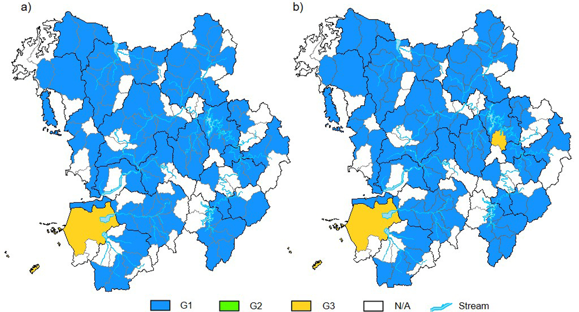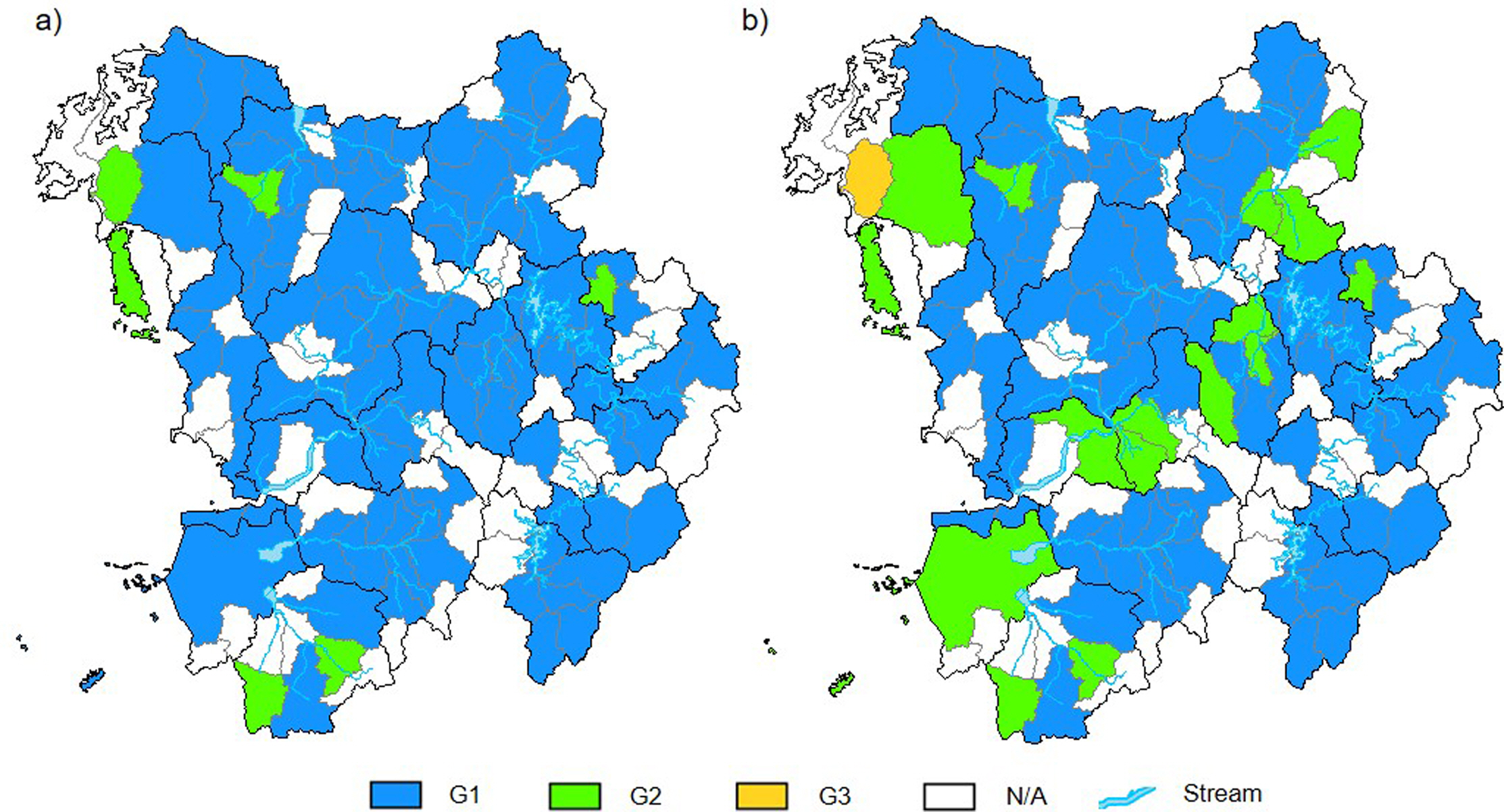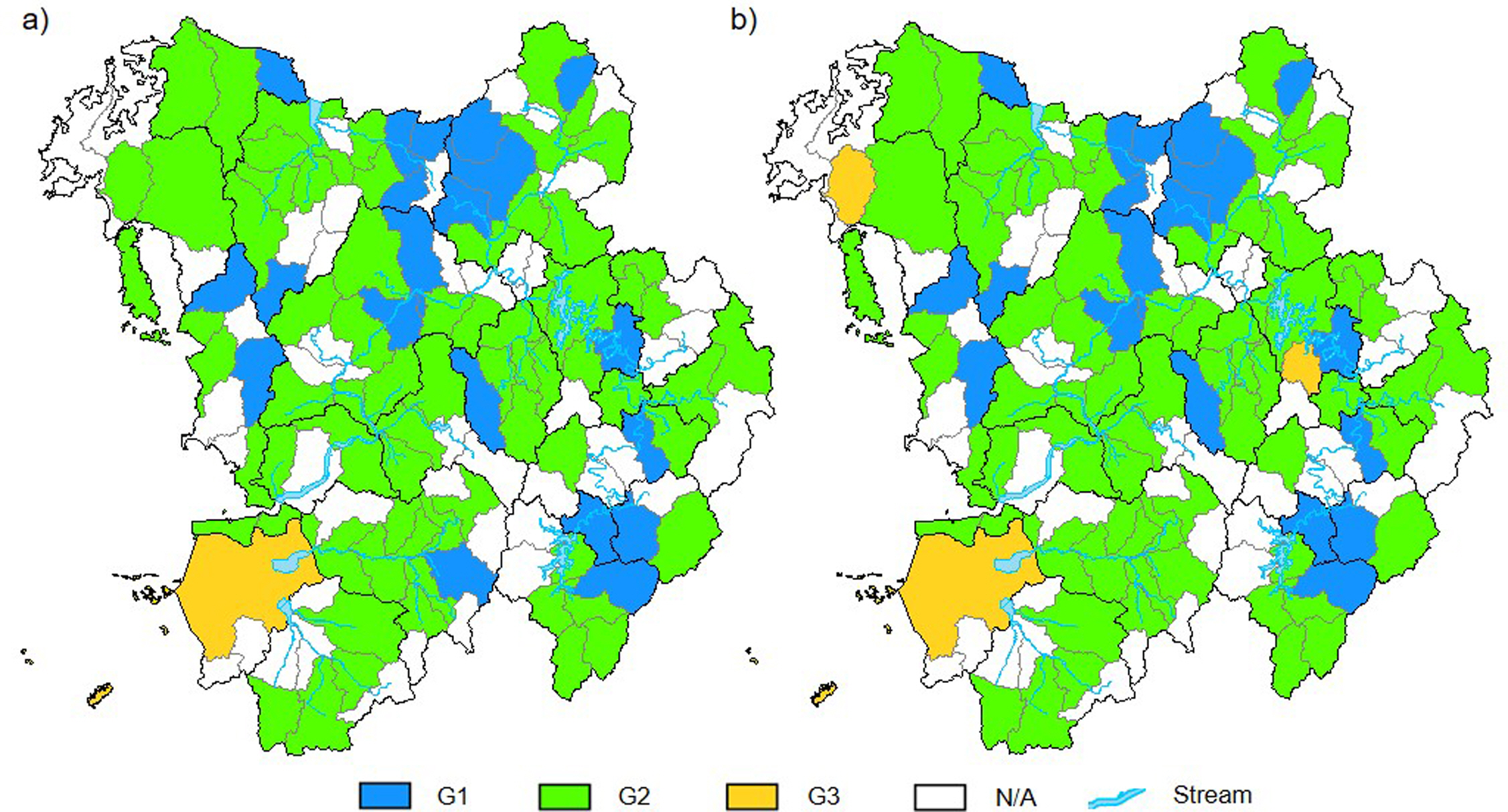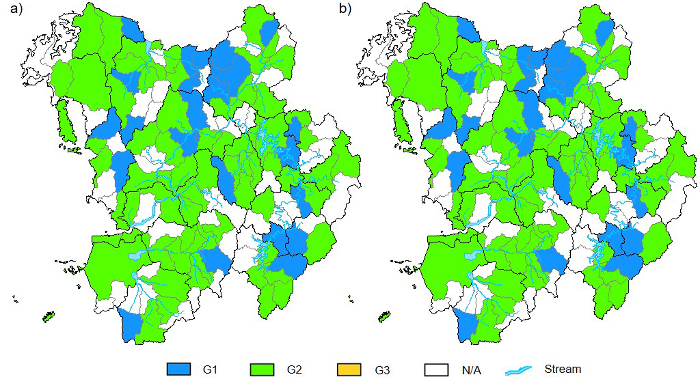 지하수수질자료의 사전검토에서 137개 표준유역 중 44개 표준유역은 측정망이 설치되어 있지 않거나 평가 기준년도 측정자료의 부재 또는 자료오류로 인하여 평가불가로 처리하고 나머지 93개 표준유역에 대해서 수질 상태를 평가하였다. 먼저 [방법 1]을 적용하여 수질 등급을 평가한 결과, 1등급인 표준유역이 87개, 2등급인 표준유역은 6개로 평가되었다(Fig. 4a). 반면에 측정망별 평균값에 등급을 평가한 후 유역 내 측정망 중 가장 낮은 등급으로 해당 유역의 수질을 평가하는 [방법 2]를 적용한 결과, 1등급인 표준유역이 83개, 2등급이 9개, 그리고 3등급이 1개 표준유역인 것으로 나타났다(Fig. 4b)). [방법 1] 적용 결과와 비교하면, 1등급 표준유역이 4개 감소하였으며, 2등급이 3개, 3등급이 1개 증가하여 [방법 2]를 적용했을 때 유역의 지하수수질이 더 저하된 것으로 평가되었다.